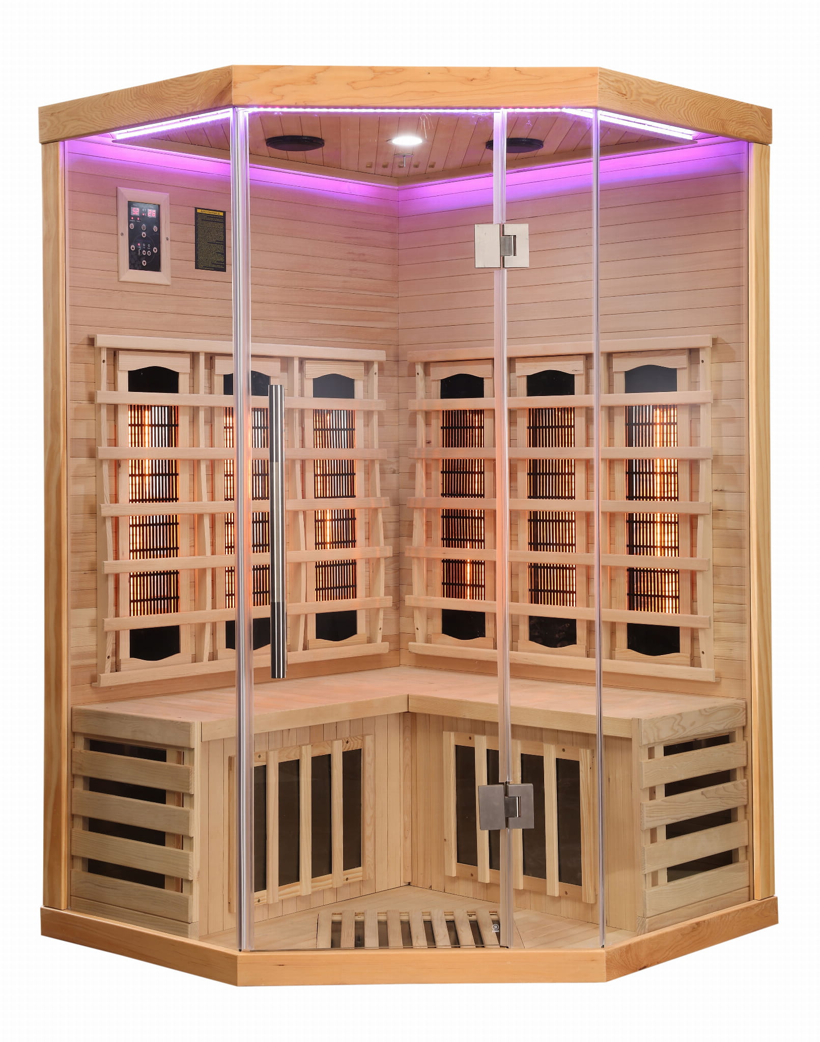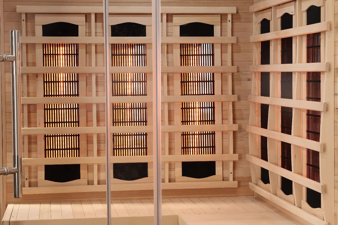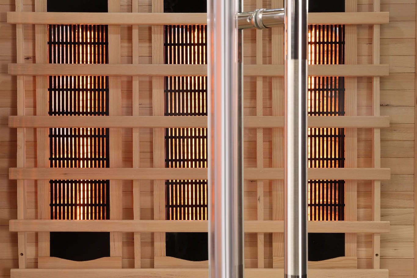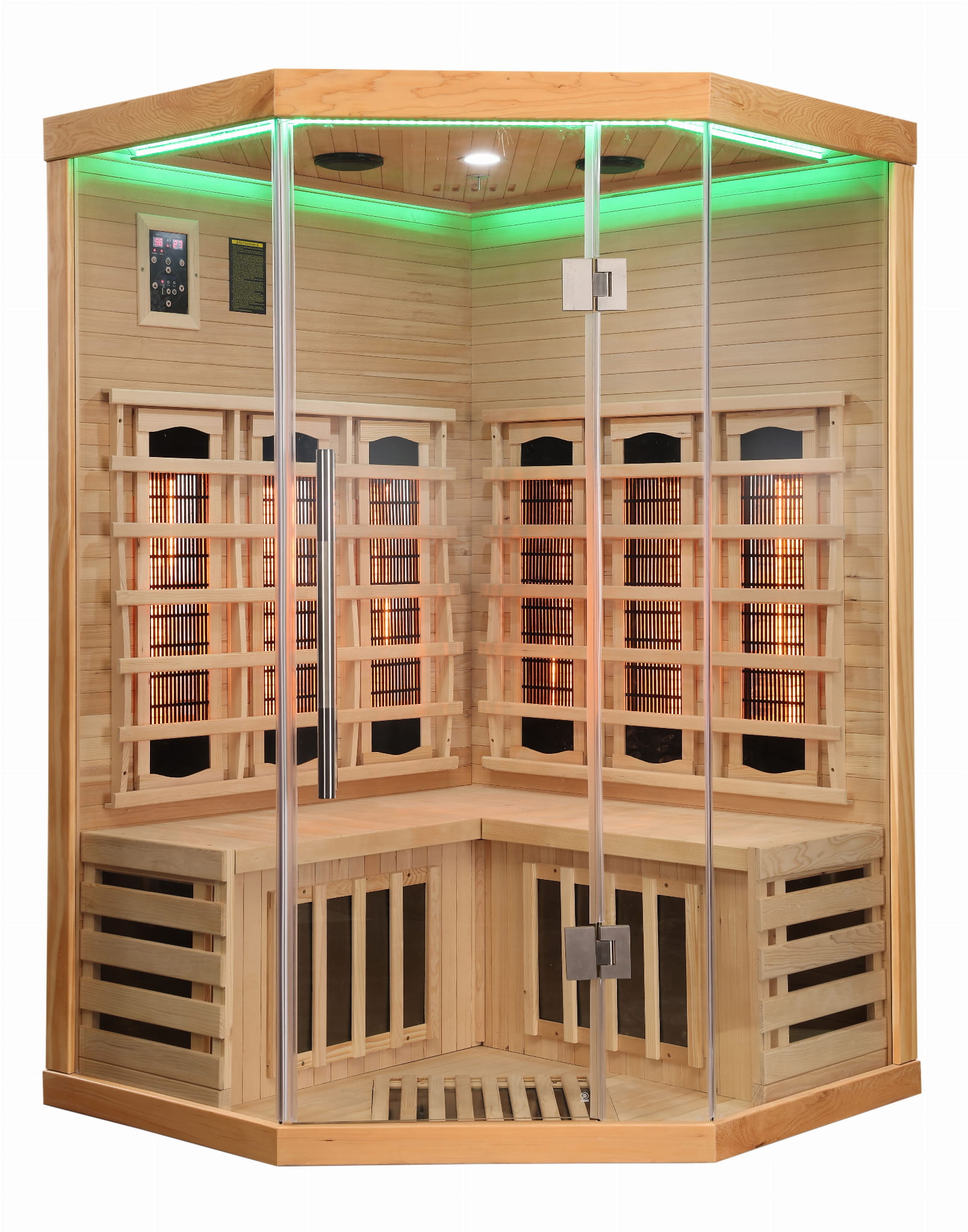 SUPREME - 2-osobowa sauna infrared z promiennikami kwarcowymi pełnego spektrum i IR-C. LED, drewno hemlock, Bluetooth, szkło 8 mm. Model SB80120 Sanotechnik.