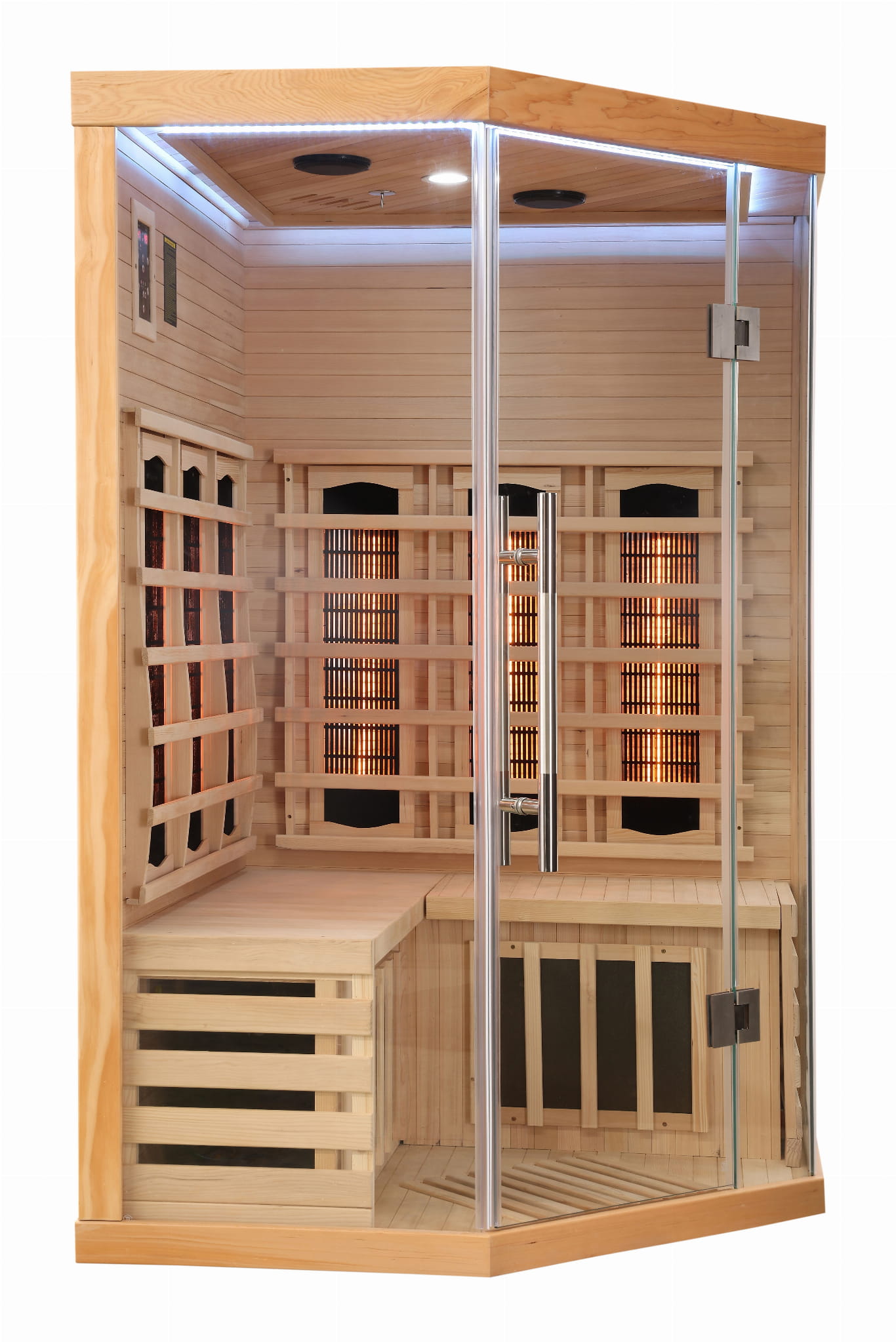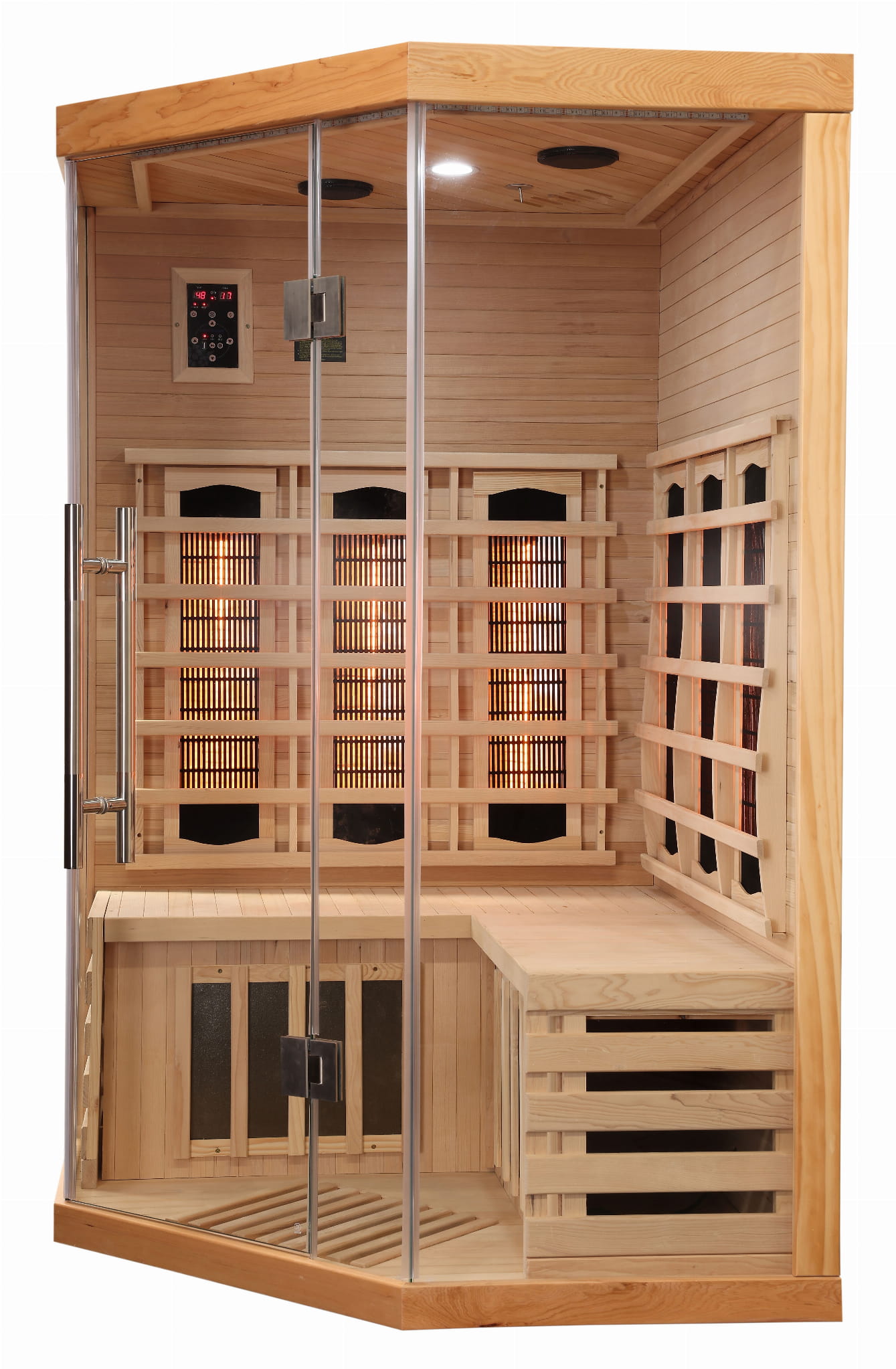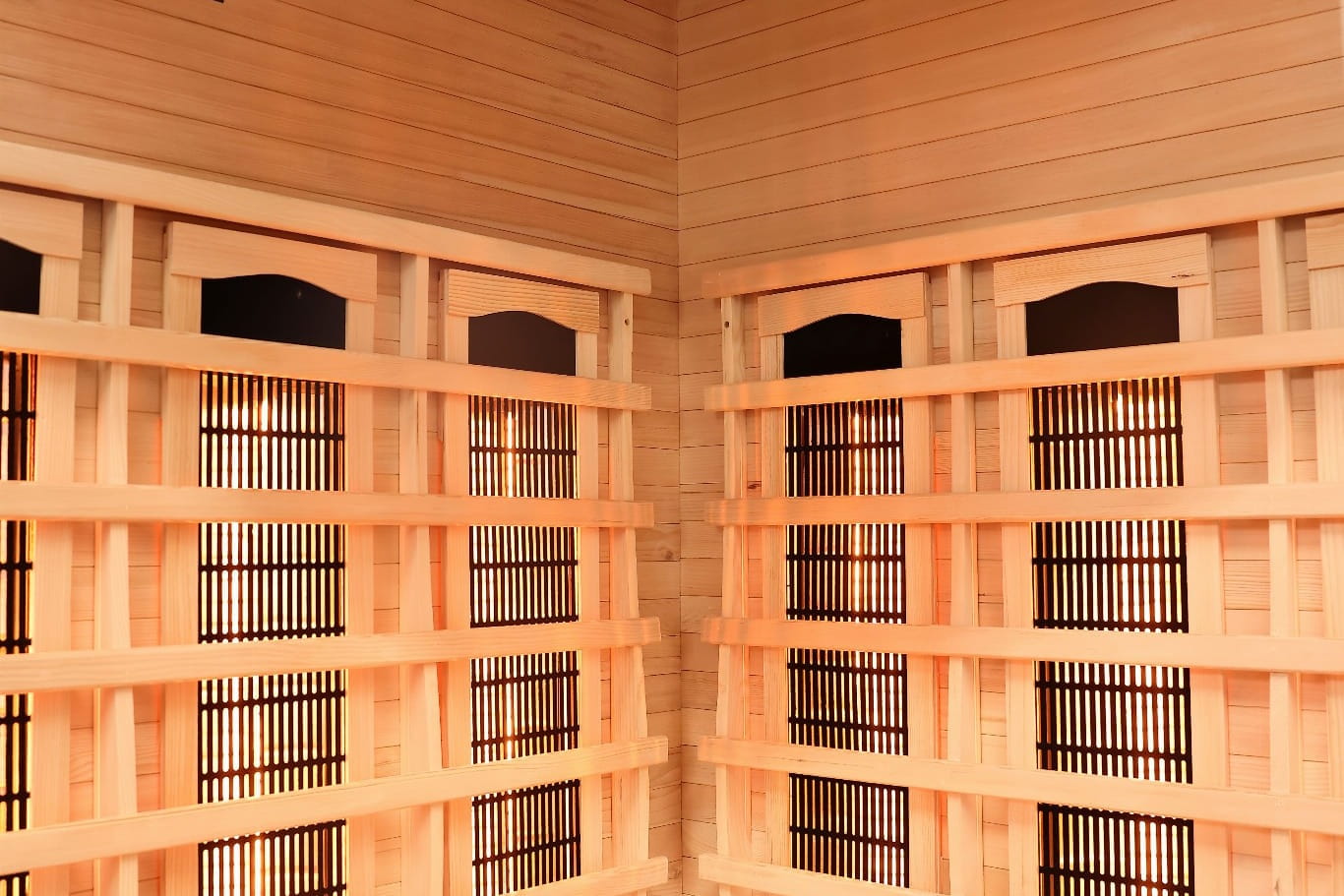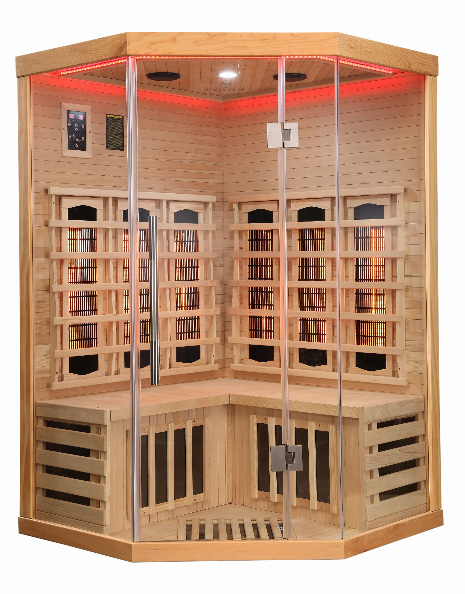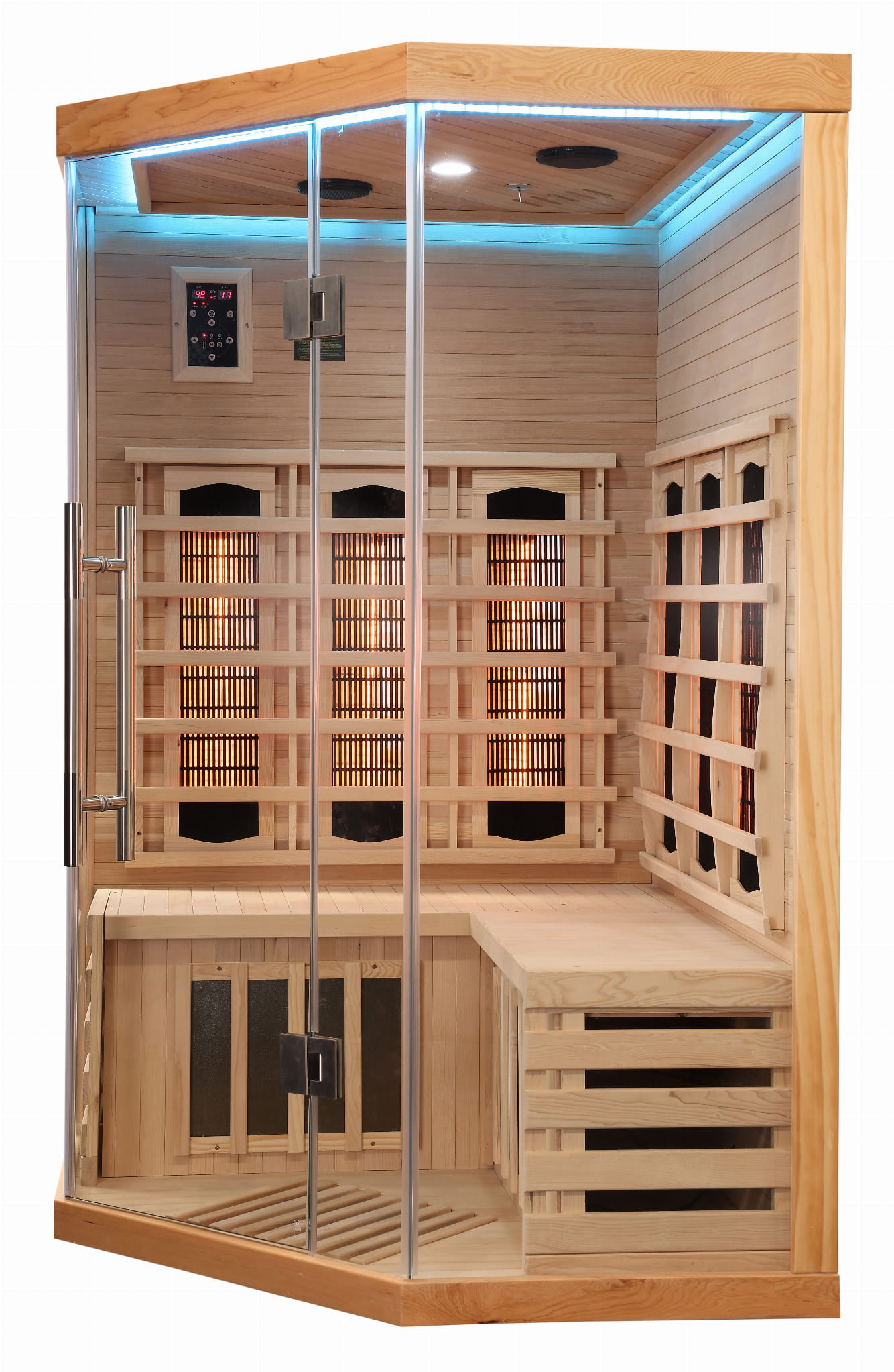 SUPREME - 2-osobowa sauna infrared z promiennikami kwarcowymi pełnego spektrum i IR-C. LED, drewno hemlock, Bluetooth, szkło 8 mm. Model SB80120 Sanotechnik.