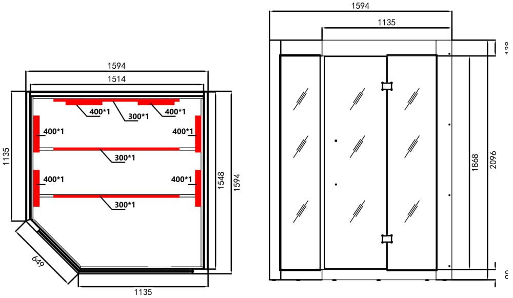 - wymiar zewnętrzny 160 x 114,1 x 64,8 x 114,1 x 160 x 210 cm