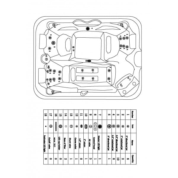 - 25 dysz masujących ze stali nierdzewnej zapewniających intensywny hydromasaż (1 dysza 4,5", 16 dysz 3,5", 8 dysz 2")
