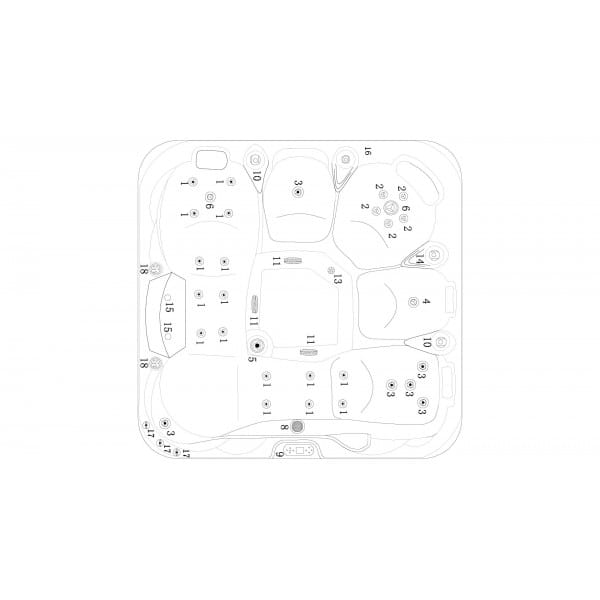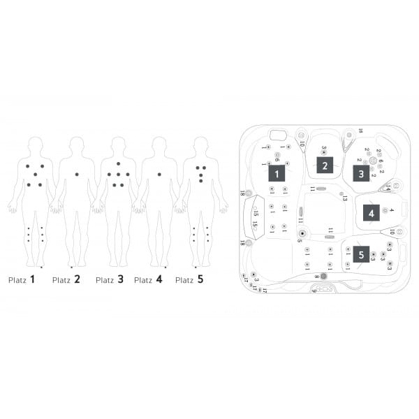 - 31 dysz masujących ze stali nierdzewnej zapewniających intensywny hydromasaż (3 dysze 4,5”, 7 dysz 3,5”, 21 dysz 2”)