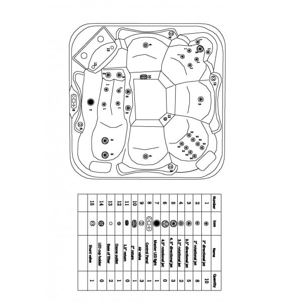 - 28 dysz masujących ze stali nierdzewnej zapewniających intensywny hydromasaż (3 dysze 4,5”, 7 dysz 3,5”, 18 dysz 2”)