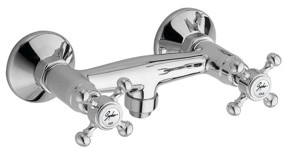 Bateria natryskowa, ścienna z dwoma kurkami art.3861. Bateria o klasycznych kształtach. Doskonale skomponuje się z wnętrzem łazienki w stylu retro. Charakteryzuje się wysoką jakością i precyzją wykonania.