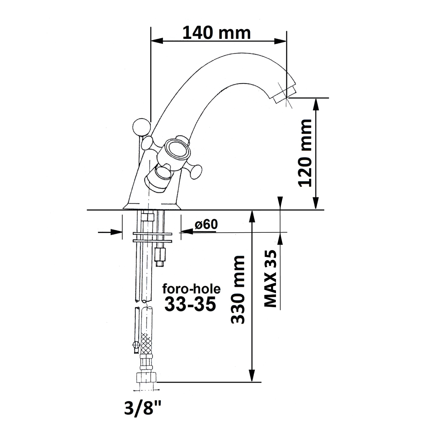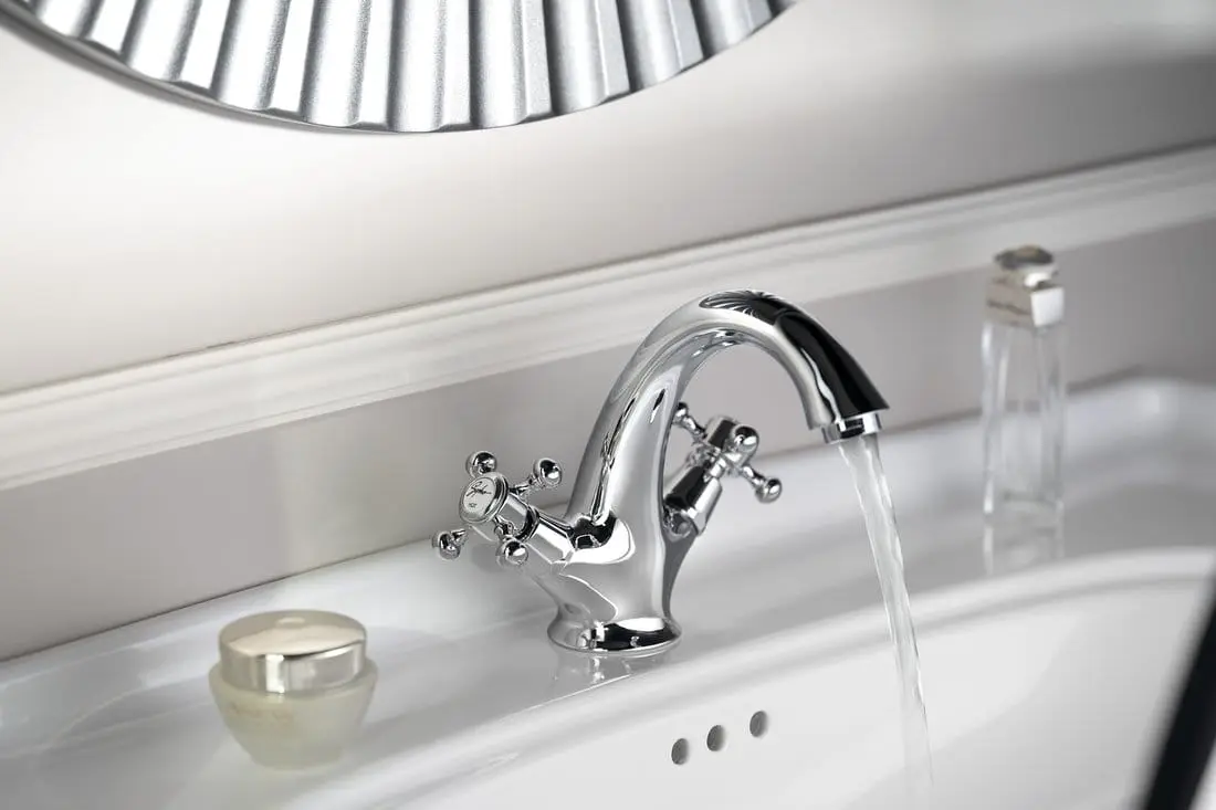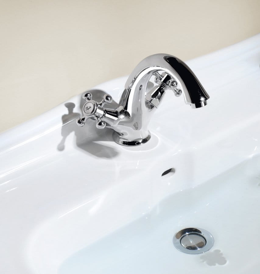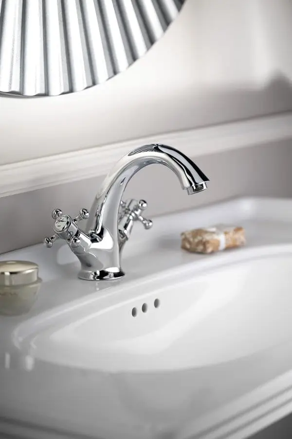 Bateria umywalkowa mosiężna, stojąca z dwoma kurkami art.3271. Bateria o klasycznych kształtach. Doskonale skomponuje się z wnętrzem łazienki w stylu retro. Charakteryzuje się wysoką jakością i precyzją wykonania.