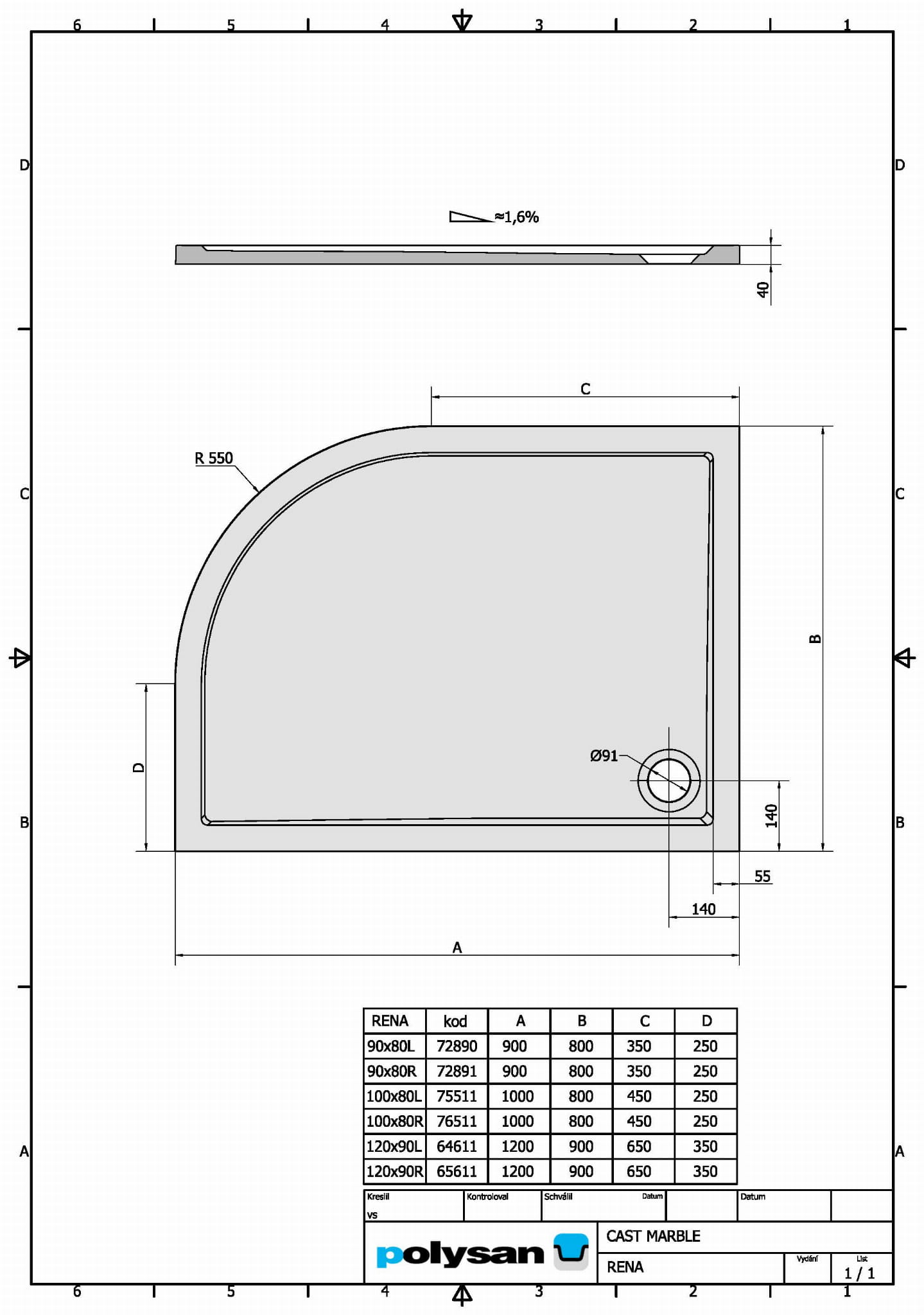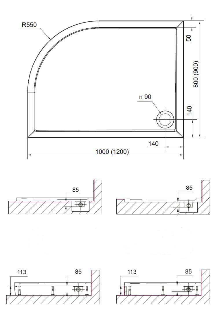 RENA L Brodzik kompozytowy półokrągły 100x80 cm, lewy 75511 - rysunek techniczny