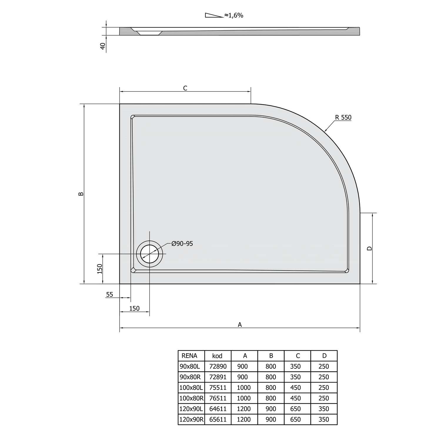 Brodzik prysznicowy półokrągły kompozytowy 90 x 80 cm prawy RENA R 72891 Polysan