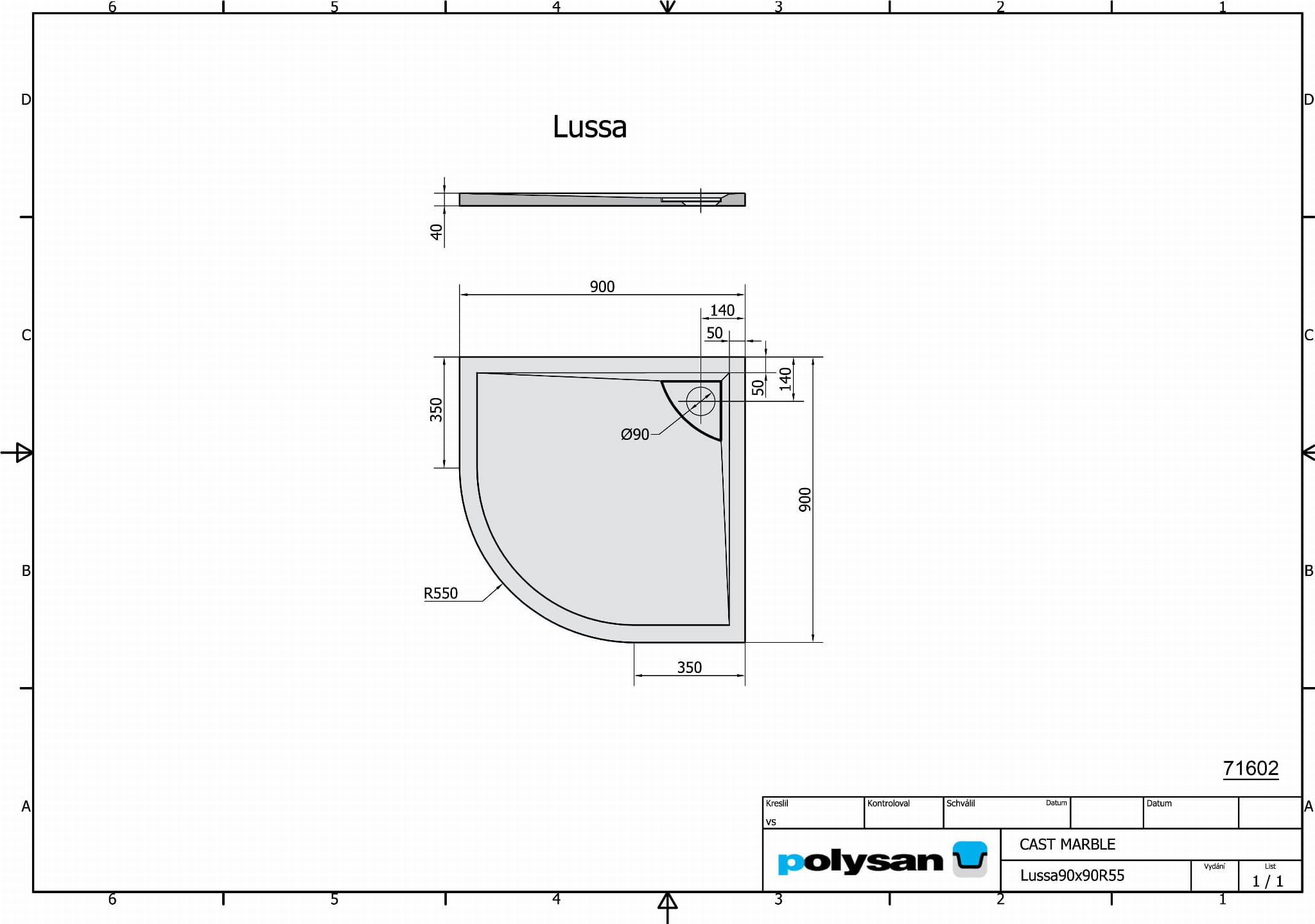 LUSSA Brodzik kompozytowy półokrągły z odpływem liniowym 90x90 cm 71602 - rysunek techniczny