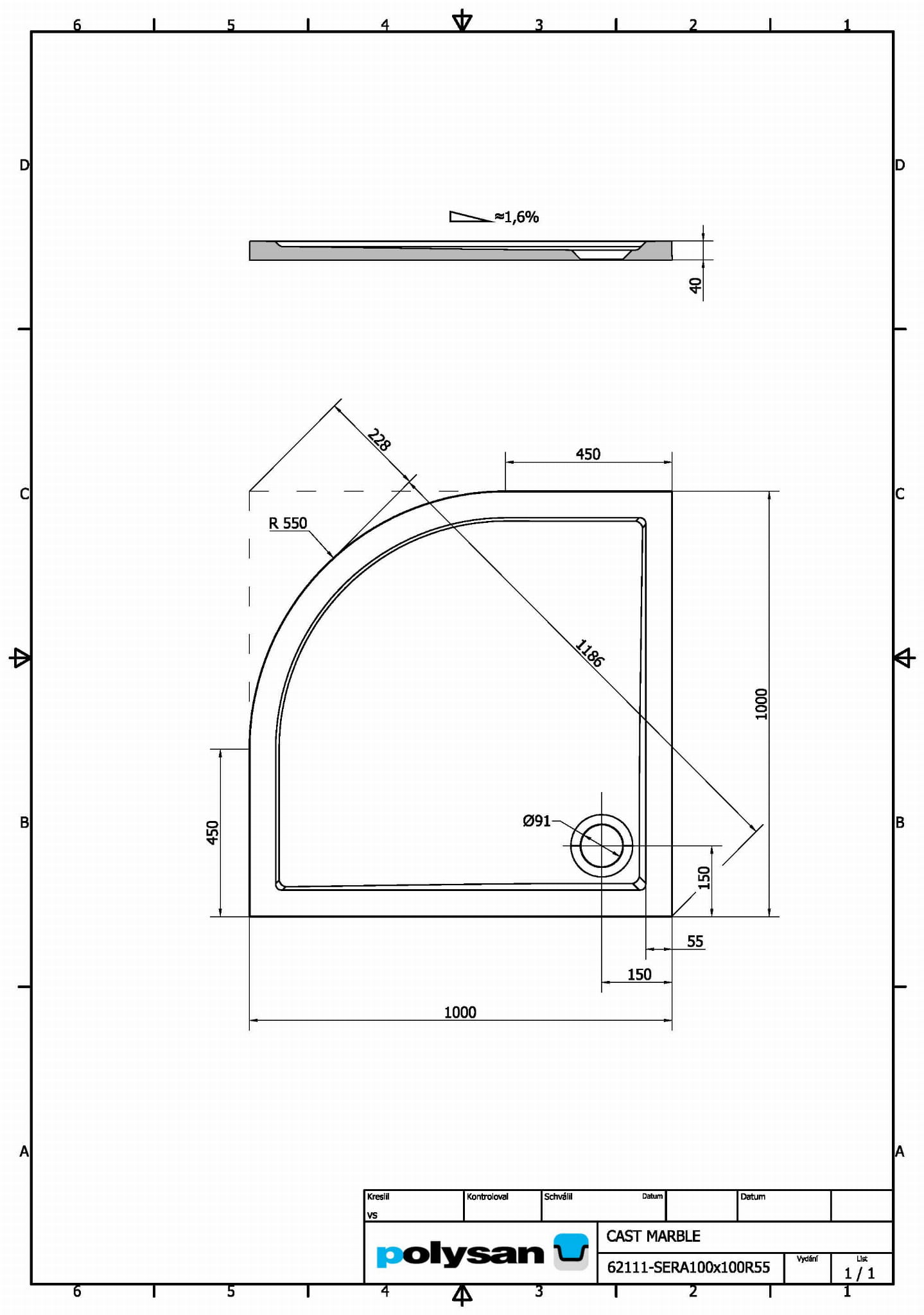 SERA Brodzik kompozytowy półokrągły R55 100x100 cm 62111 - rysunek techniczny