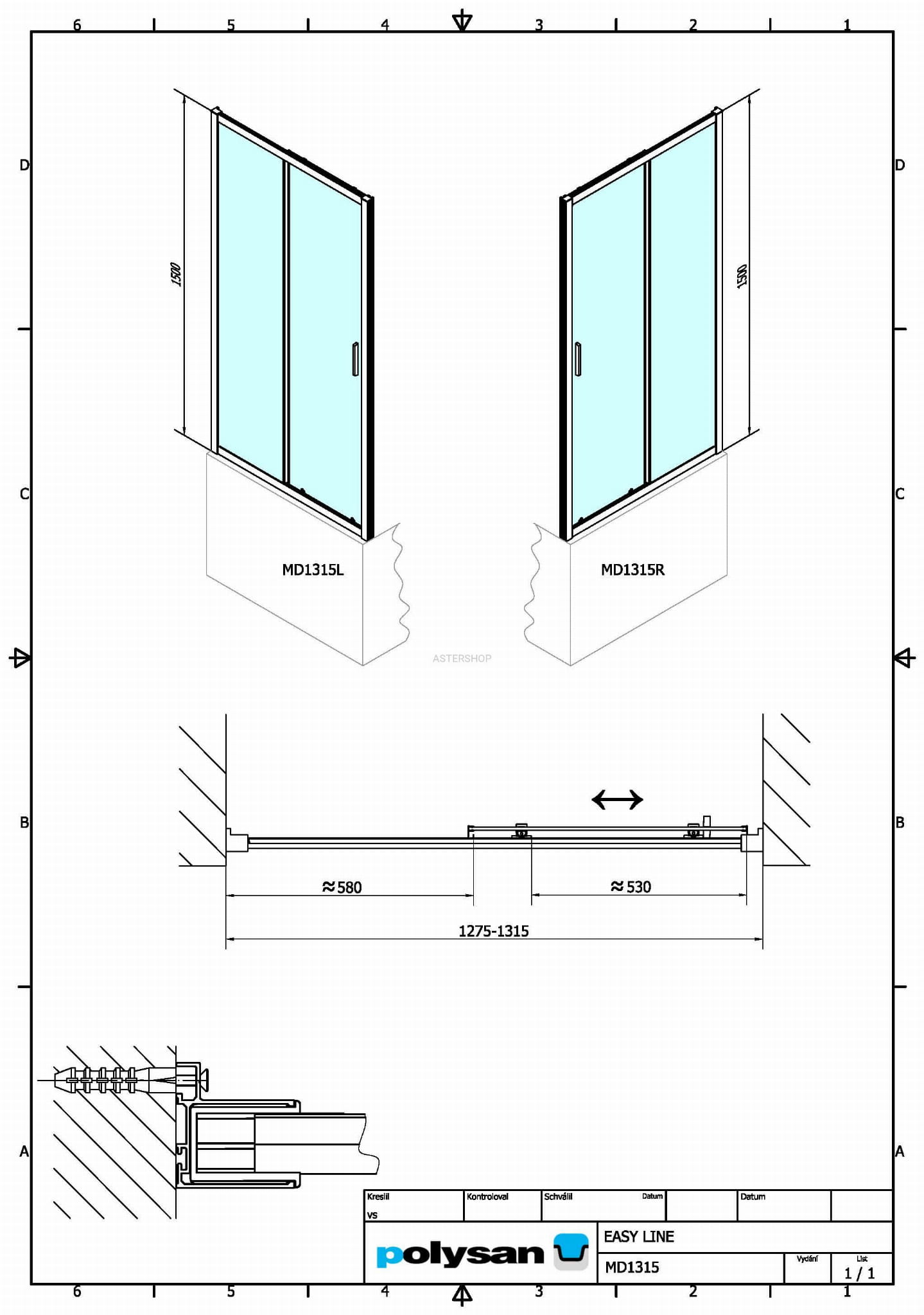DEEP Drzwi prysznicowe do wnęki przesuwne 130x150 cm szkło czyste MD1315 rysunek techniczny