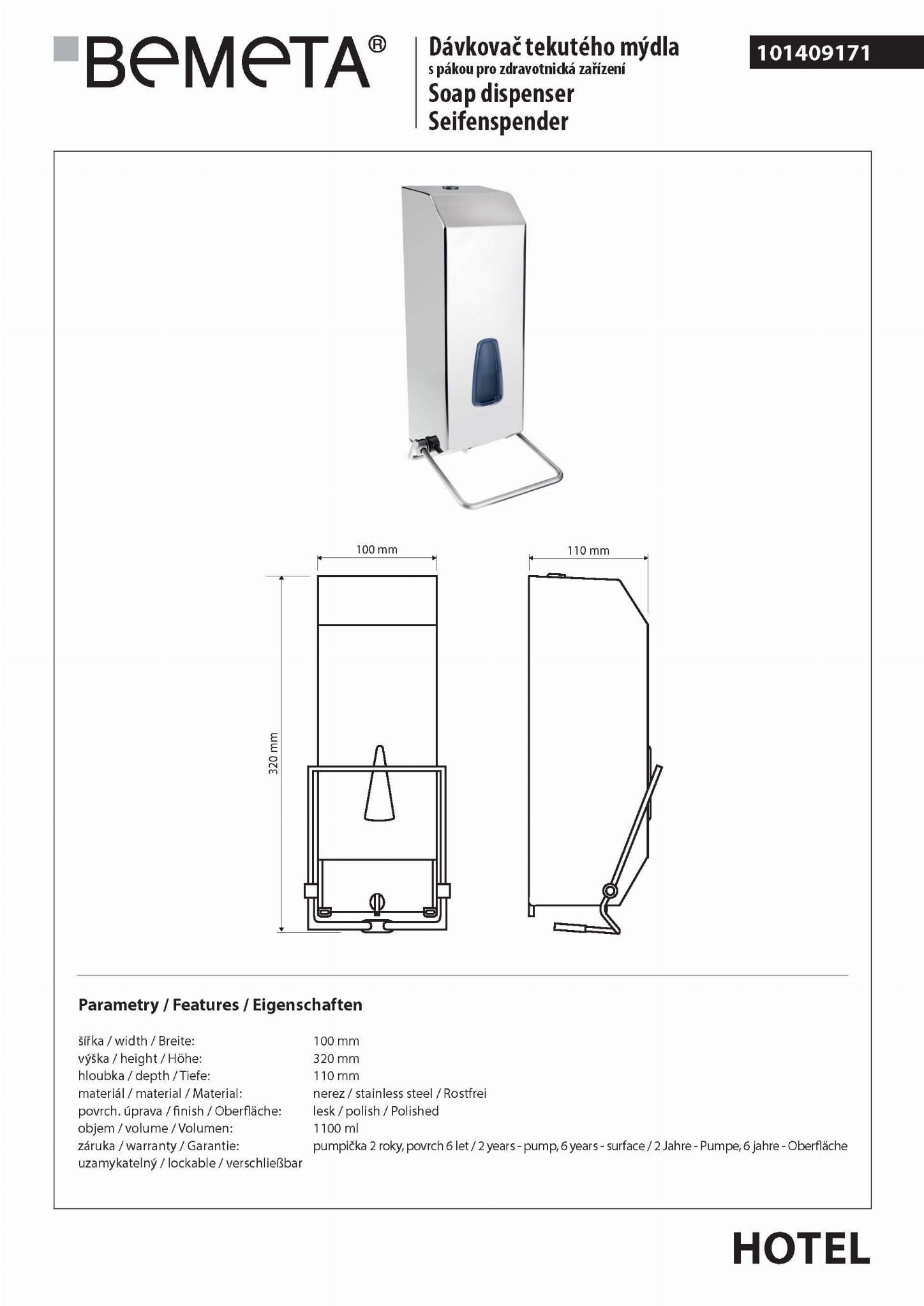 Dozownik do mydła 1100 ml stal nierdzewna 101409171 Bemeta