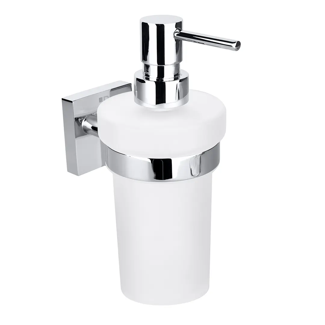 Uchwyt wykonany z mosiądzu, pokryty chromem w wykończeniu chrom połysk. Pojemnik ze szkła mlecznego.