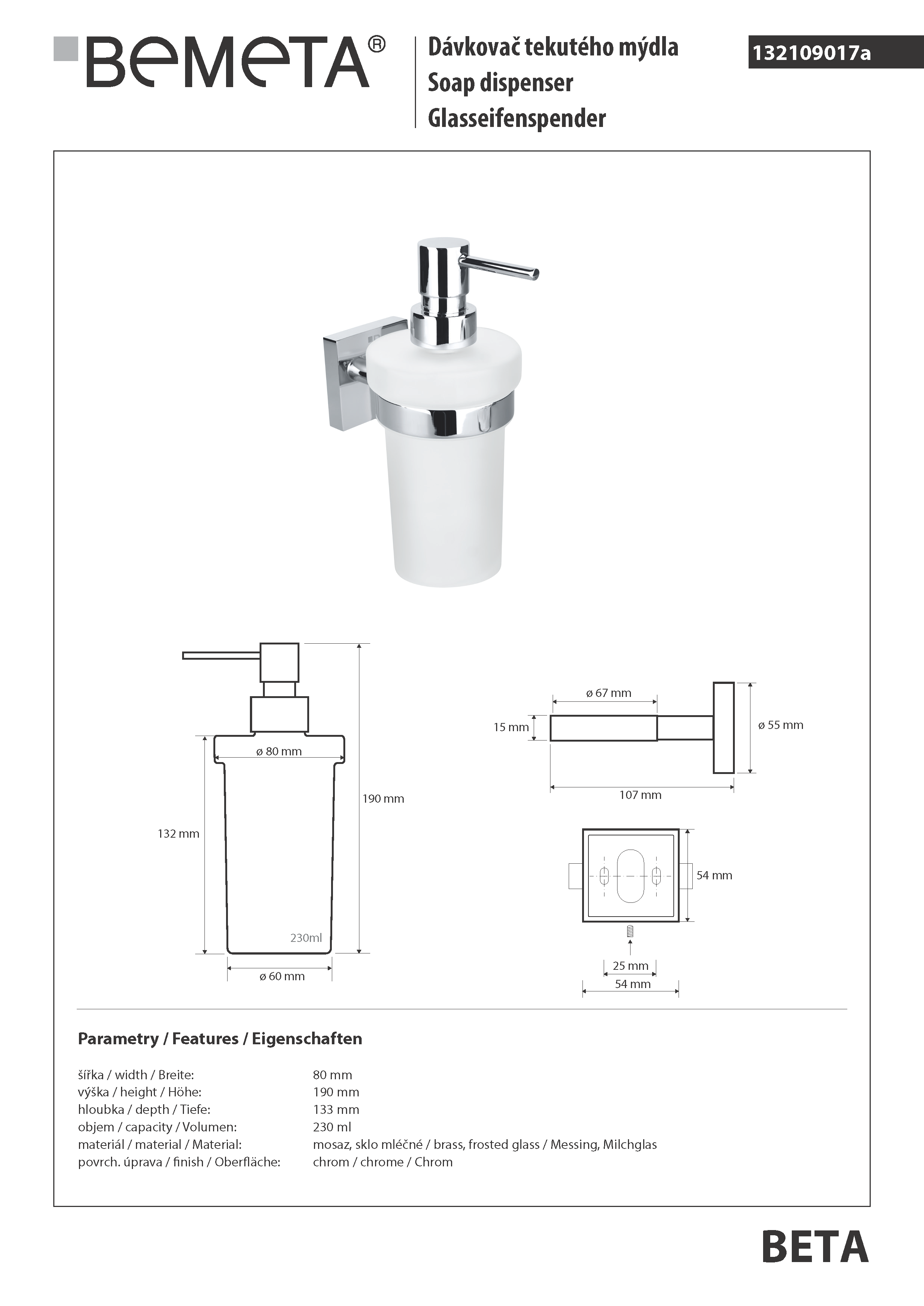 Dozownik do mydła 230 ml BETA 132109017 Bemeta wymiary