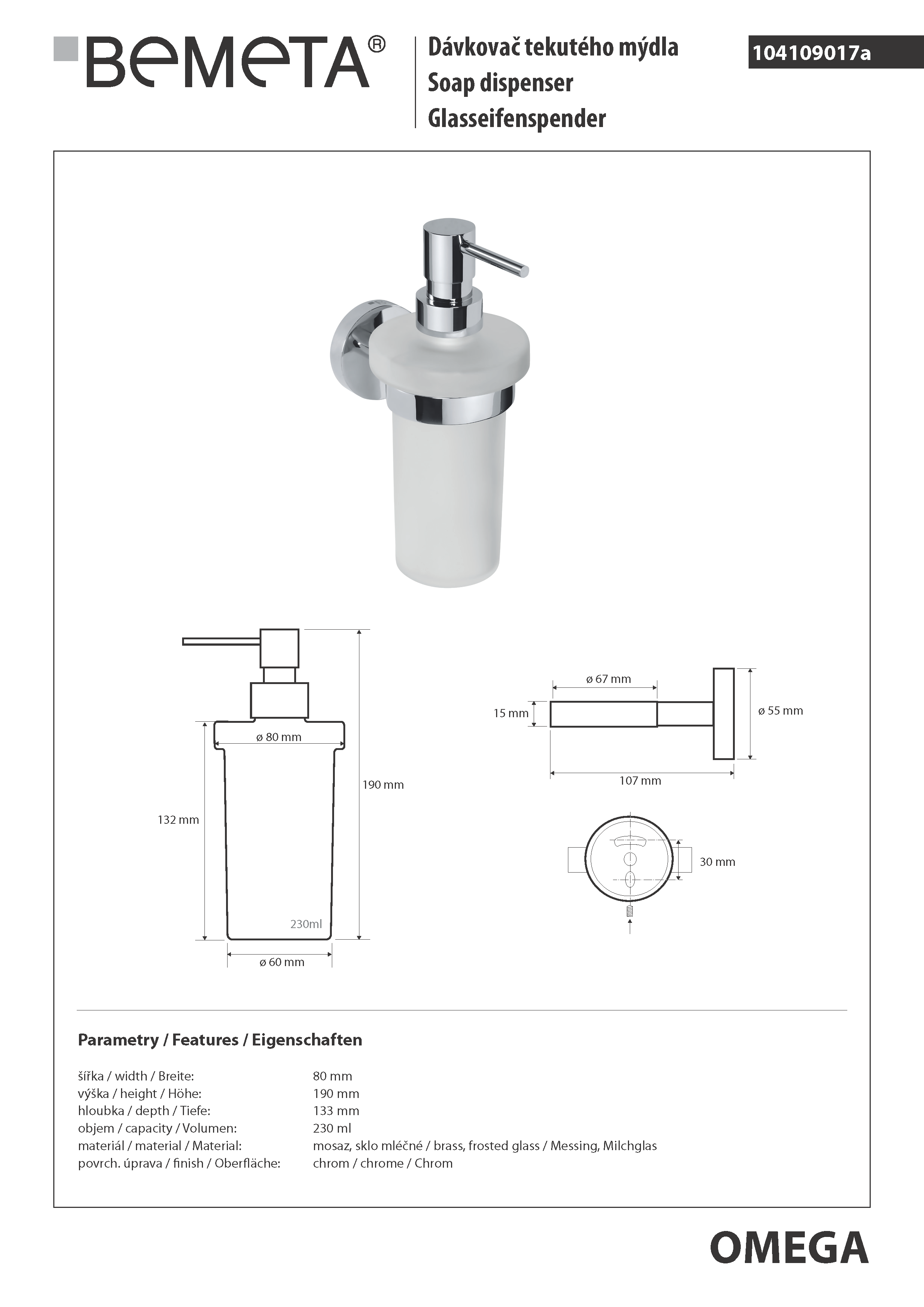 Dozownik do mydła 230 ml OMEGA 104109017 Bemeta wymiary