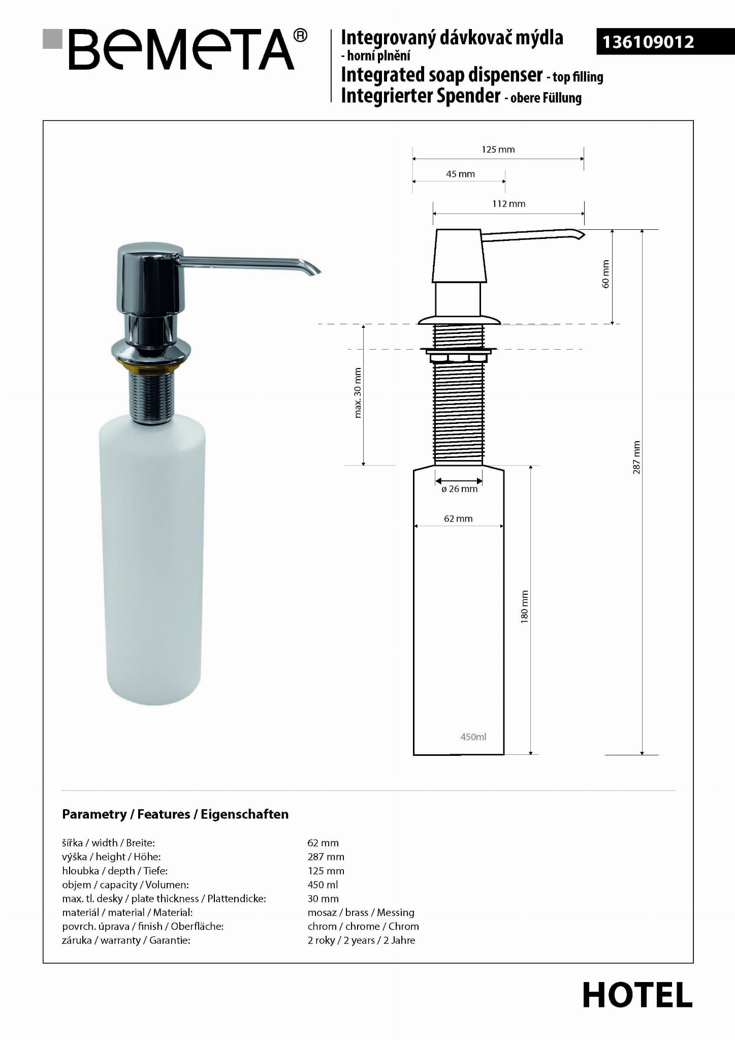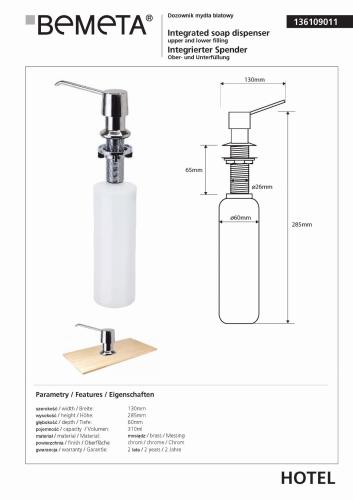 Dozownik podblatowy do mydła, górne napełnianie 136109012 Bemeta