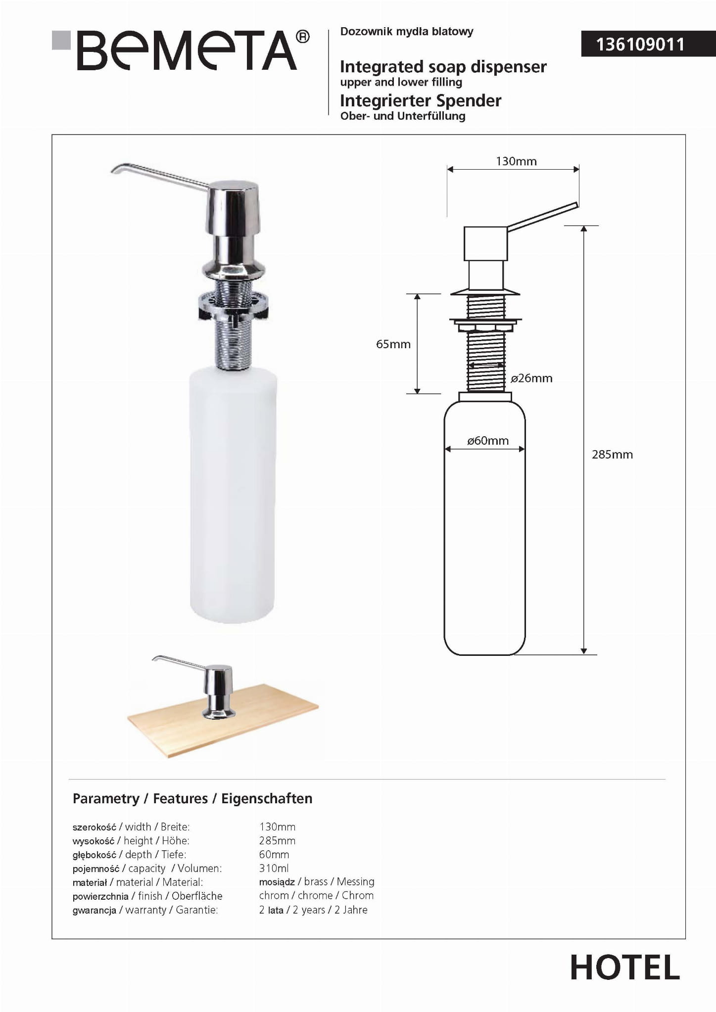 Dozownik podblatowy do mydła górne napełnianie 136109012 Bemeta