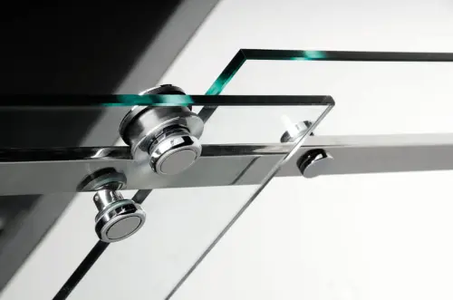 Szkło bezpieczne o grubości 8 mm. Szkło poddawane obróbce nanotechnologicznej i pokrywane dwustronnie warstwą "antidrop" zabezpieczającą osadzanie się kamienia wapiennego i osadów mydlanych, w standardzie, bez dodatkowej opłaty.