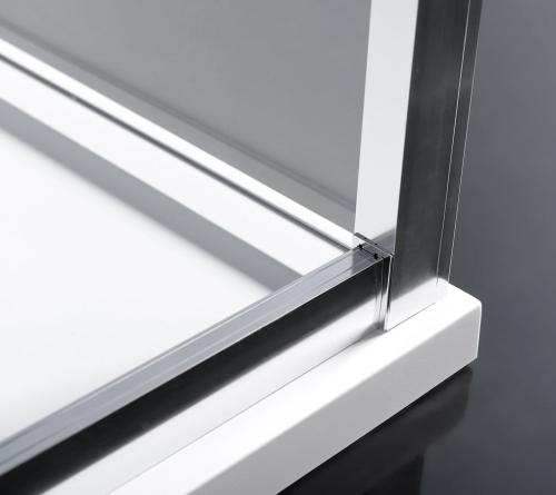 Drzwi zawieszone na podwójnych rolkach poruszających się na estetycznie wyprofilowanej szynie zapewniają długotrwałe bezawaryjne użytkowanie. Szkło hartowane o grubości 6mm jest osadzone w gładkich i płaskich profilach z polerowanego aluminium.