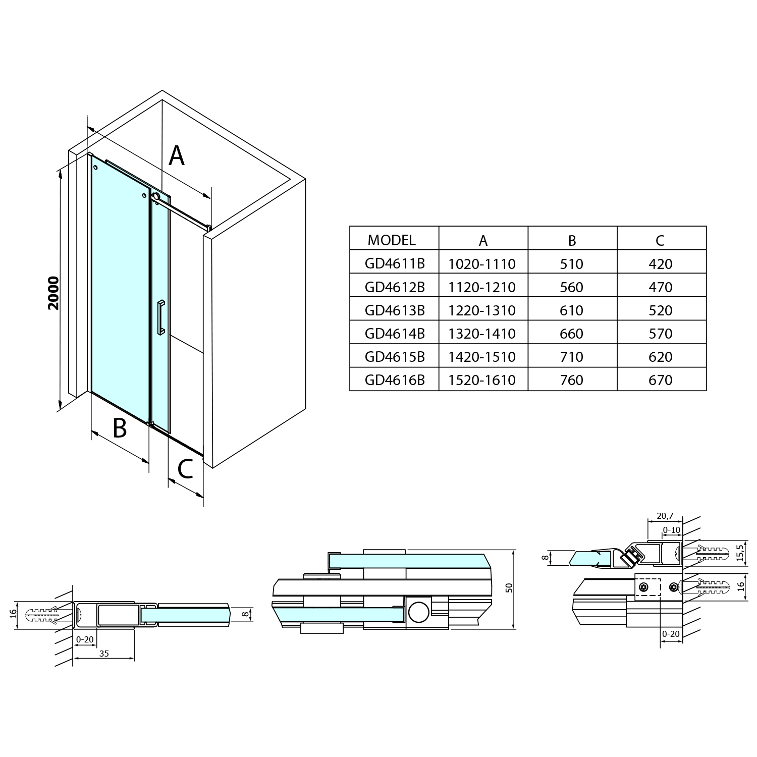 Wysokość - 200 cm. Do drzwi można dokupić brodzik akrylowy lub z kompozytu marmurowego oraz syfon.