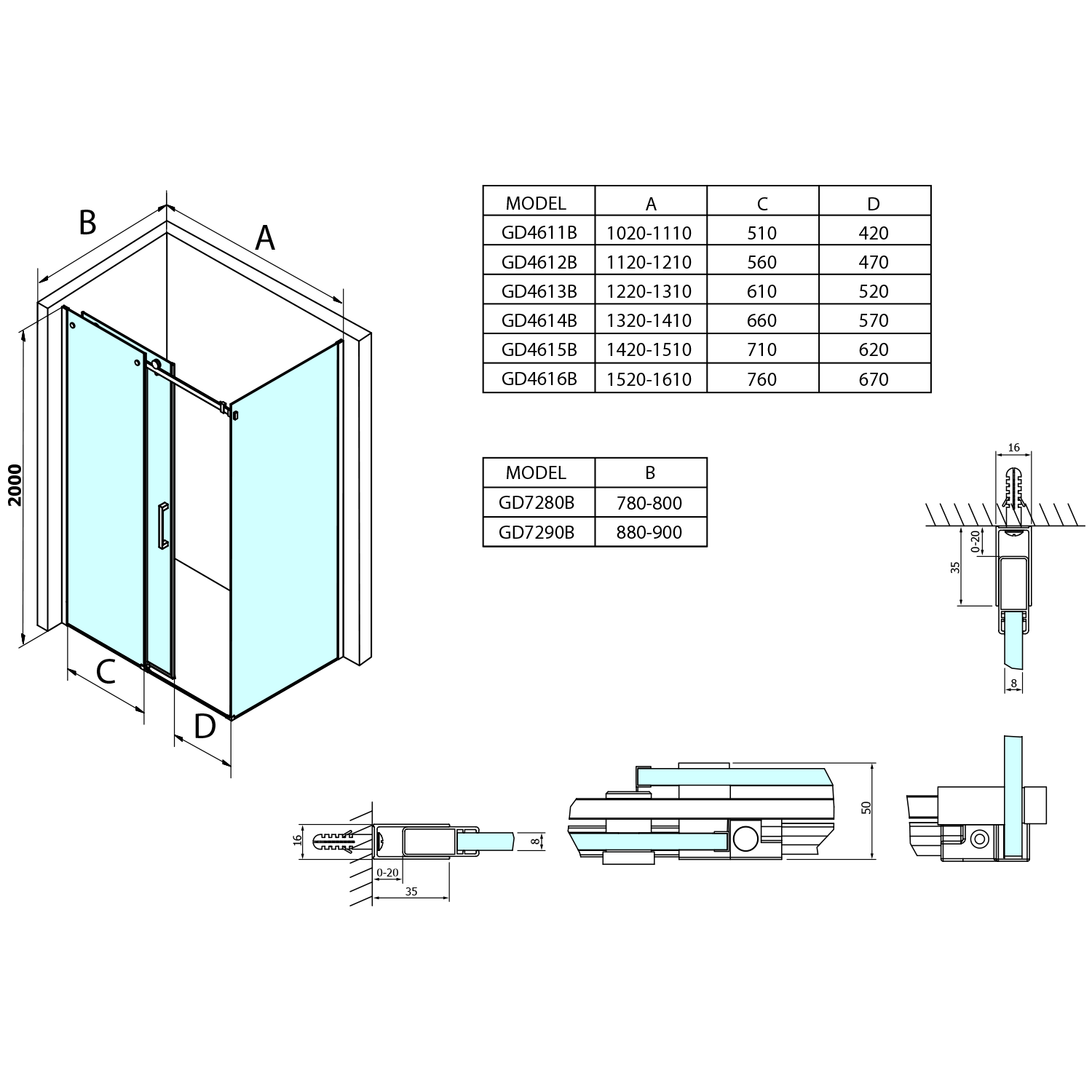Kompletując drzwi z boczną ścianką GD7280B otrzymamy prostokątną kabinę 1600x800 mm