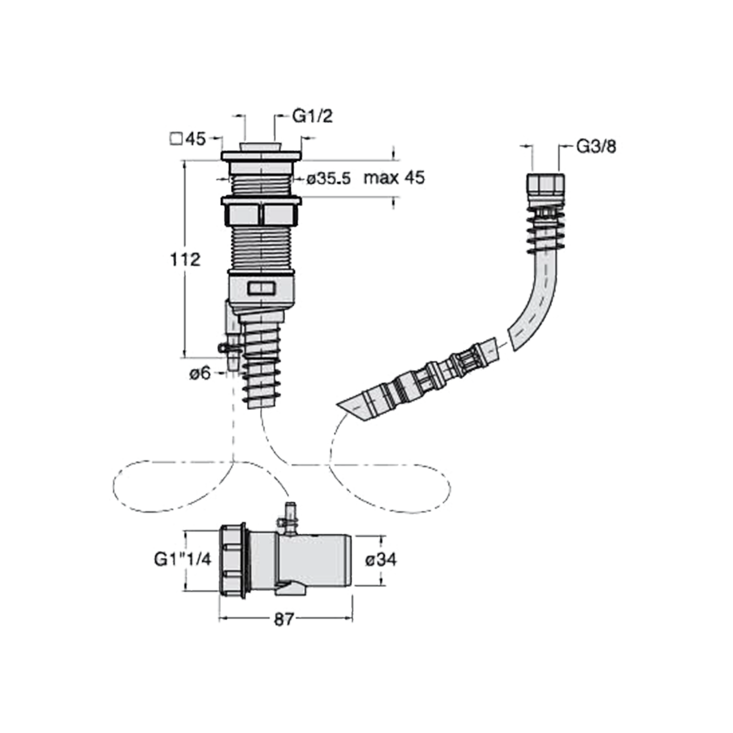 Kwadratowe gniazdo rączki prysznicowej z wężem w systemie FLLOW ME, montowane na brzegu wanny.