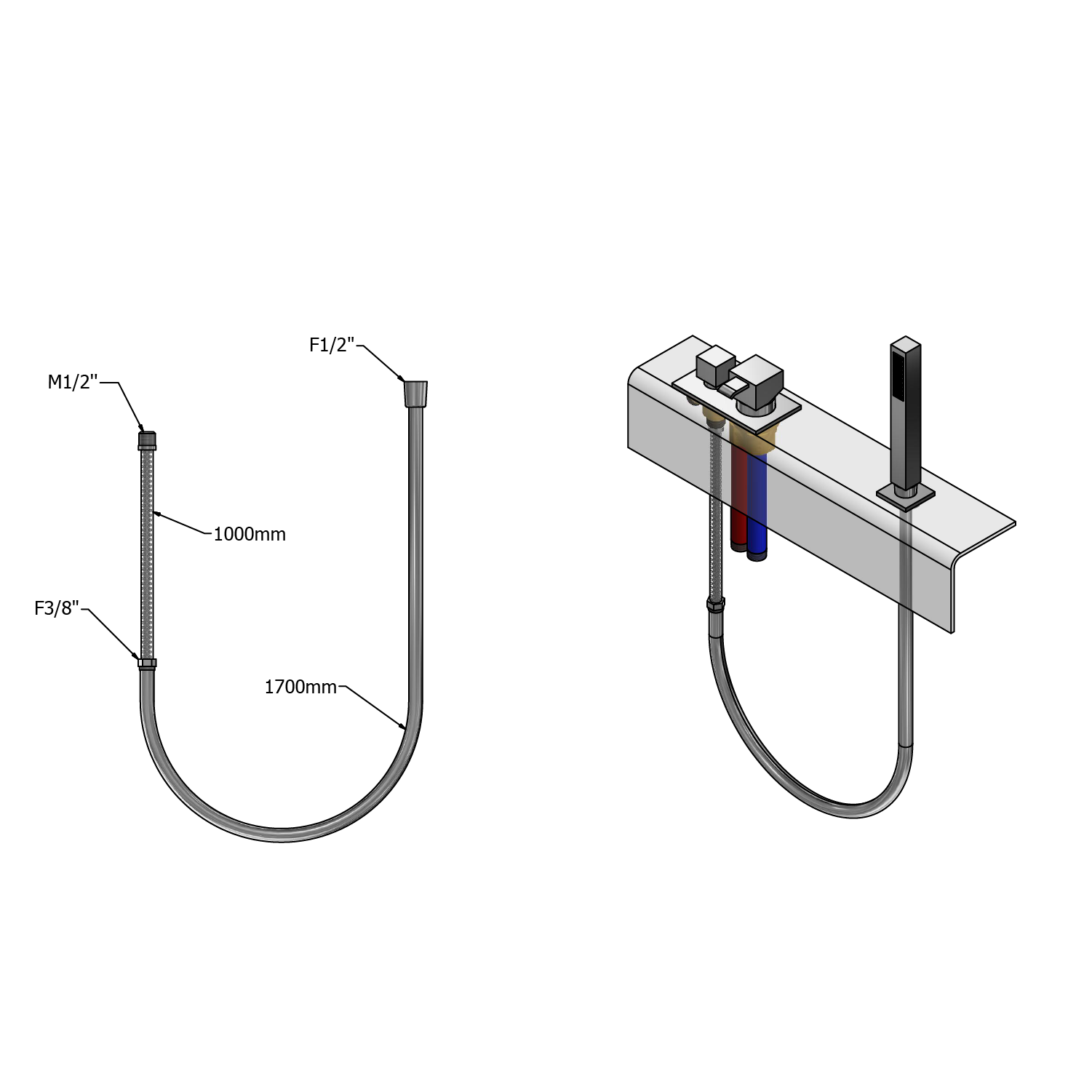 Gniazdo pod rączkę prysznicową, kwadratowe w komplecie z wężem prysznicowym o długości 170 cm, mosiądz pokryty chromem.