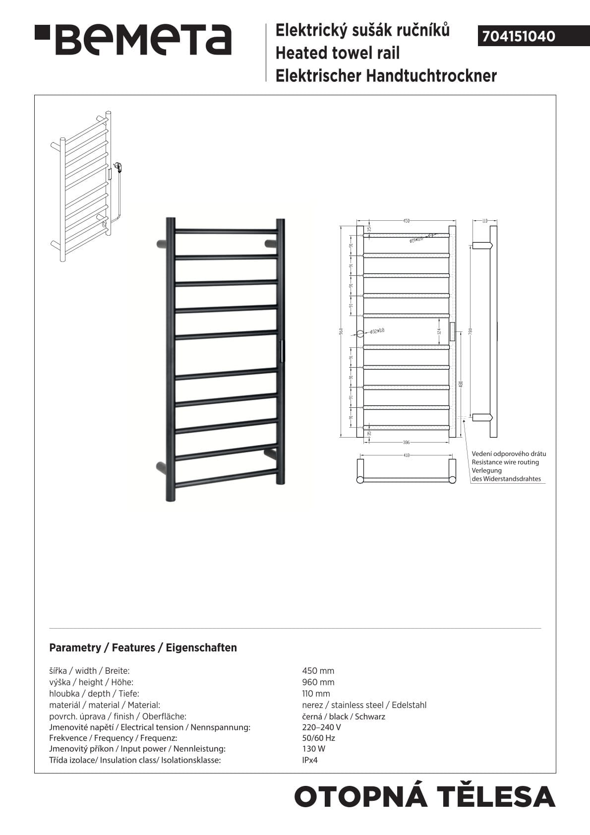 Grzejnik elektryczny na ręczniki drabinkowy ścienny 450 x 960 mm 130 W czarny 704151040 Bemeta
