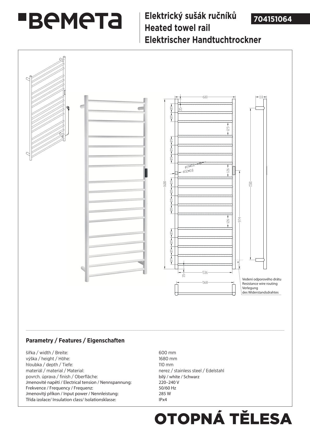 Grzejnik elektryczny na ręczniki drabinkowy ścienny 600 x 1680 mm 285 W biały 704151064 Bemeta