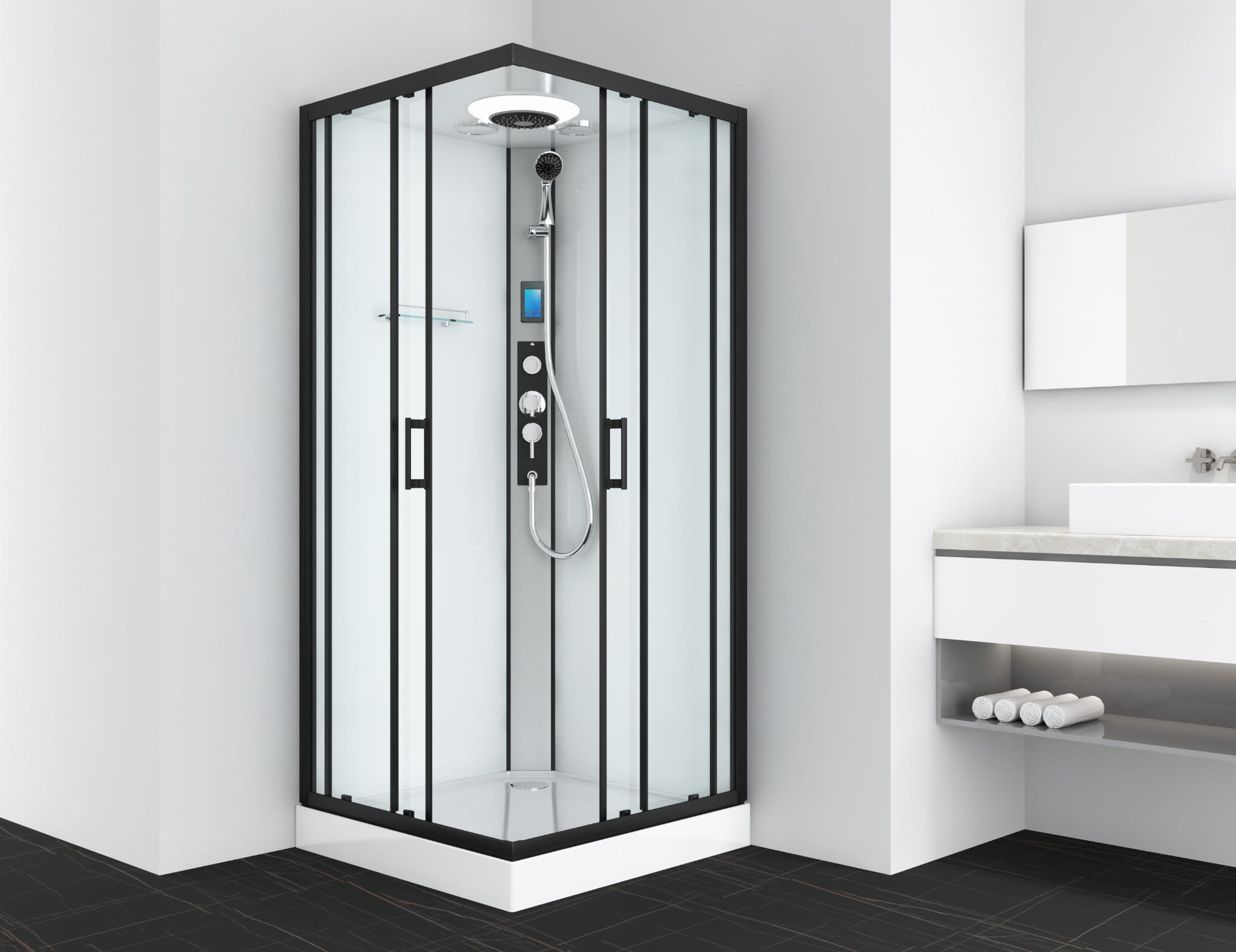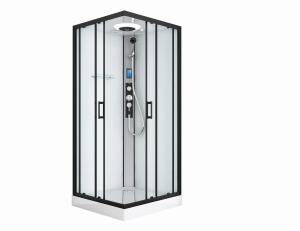 Kabina prysznicowa kwadratowa wolnostojąca czterościenna 90 x 90 x 215 cm profil czarny CL21B Sanotechnik