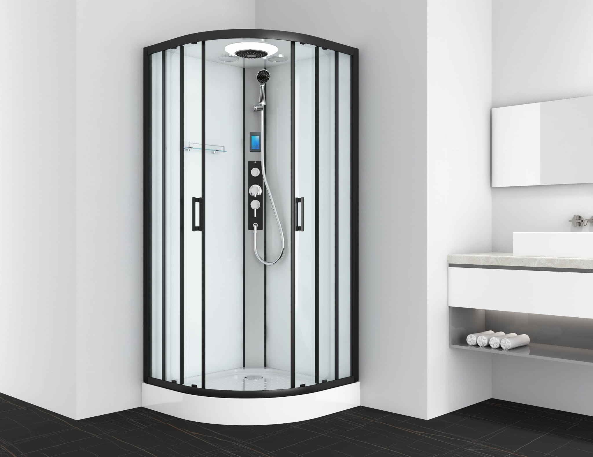 Kabina prysznicowa półokrągła wolnostojąca czterościenna 90 x 90 x 215 cm czarny profil CL20B Sanotechnik