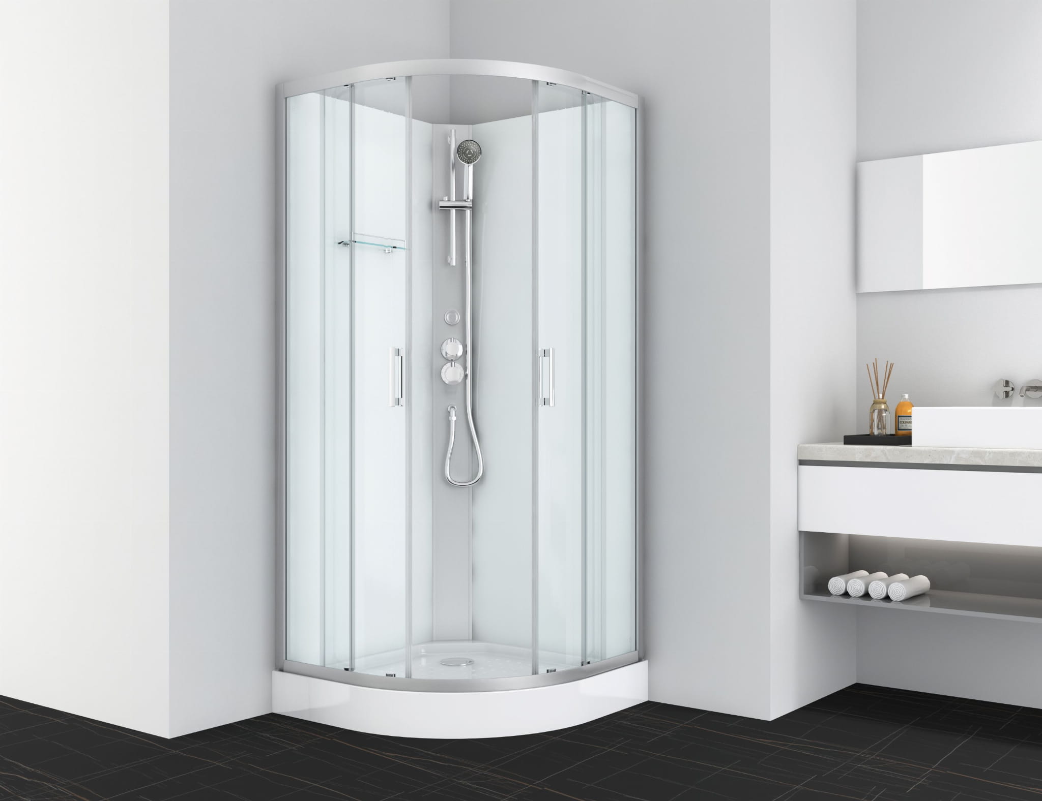 Nasz produkt jest kompletnym zestawem, który posiada wszystkie niezbędne elementy potrzebne do zamontowania w pełni funkcjonalnej kabiny prysznicowej