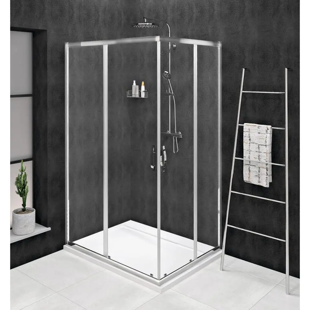 - Kwadratowe i prostokątne kabiny z wejściem narożnym, stworzysz łącząc dwoje drzwi przesuwnych w wejście narożne