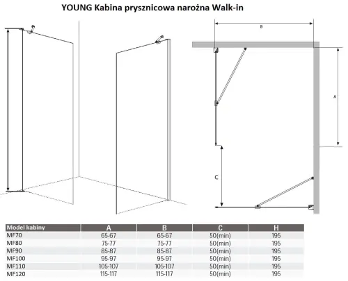 YOUNG Kabina narożna Walk-in 70-120x195 cm MF70 -MF120 - instrukcja