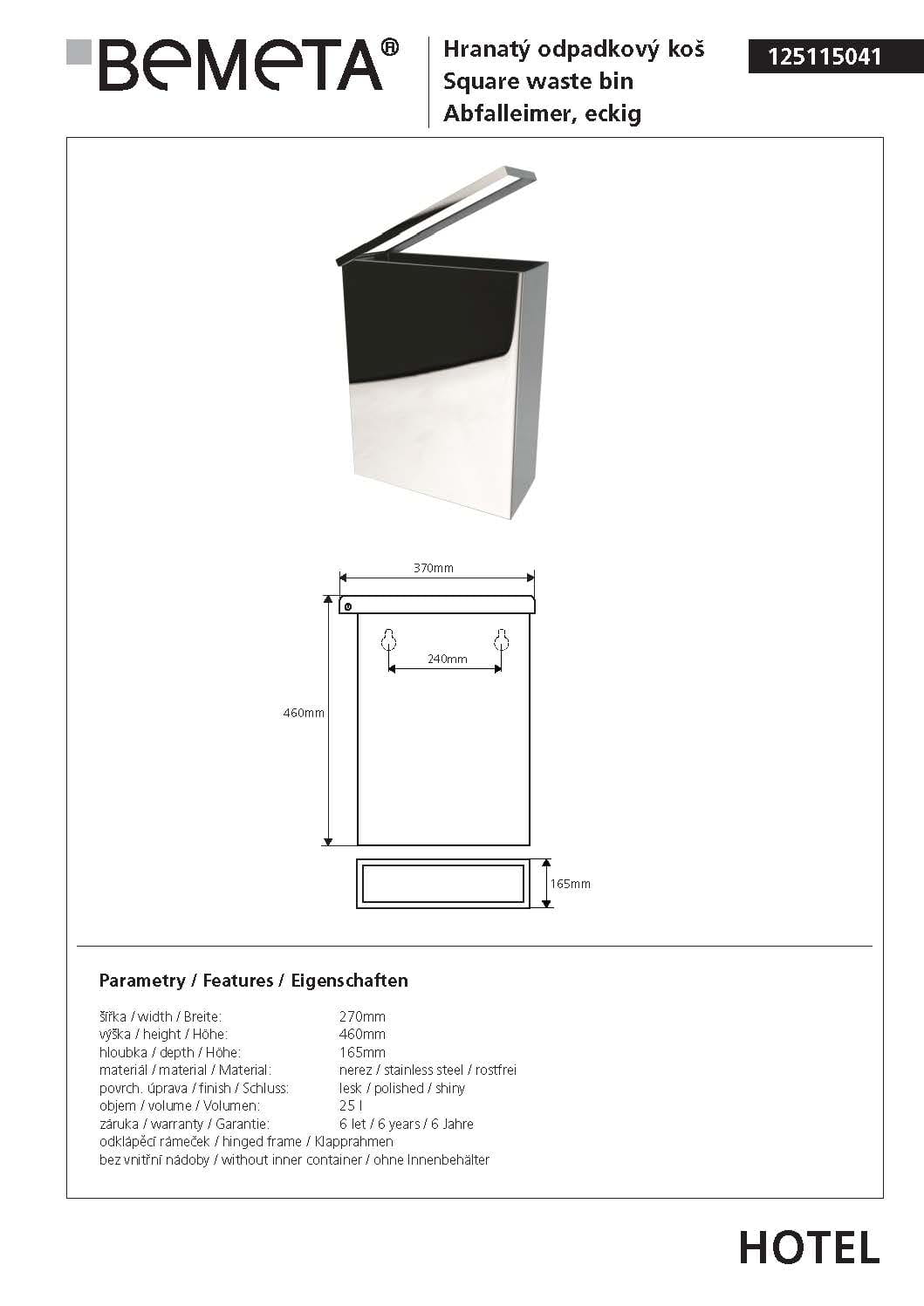 Kosz na śmieci 25l wiszący prostokątny połysk 125115041 Bemeta