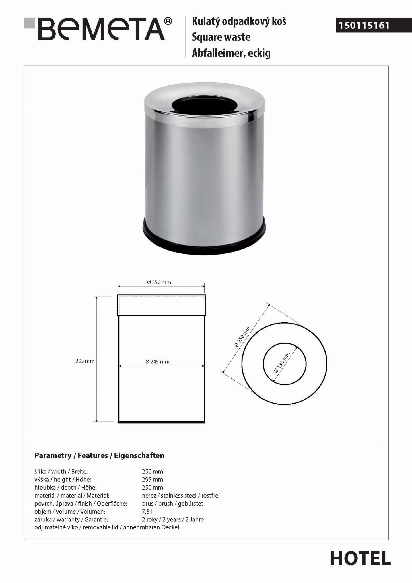 Kosz na śmieci 7,5l stojący bez pokrywy połysk 150115161 Bemeta