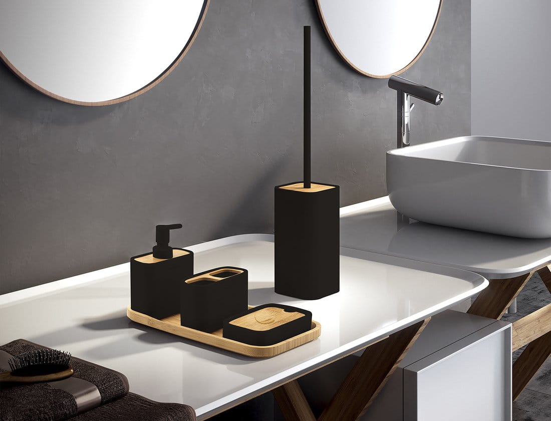 Połączenia klasycznej matowej czerni i bambusa, sprawia że seria Ninfea jest bardzo elegancka i ponadczasowa i sprawdzi się w nowoczesnych albo loftowych wnętrzach.