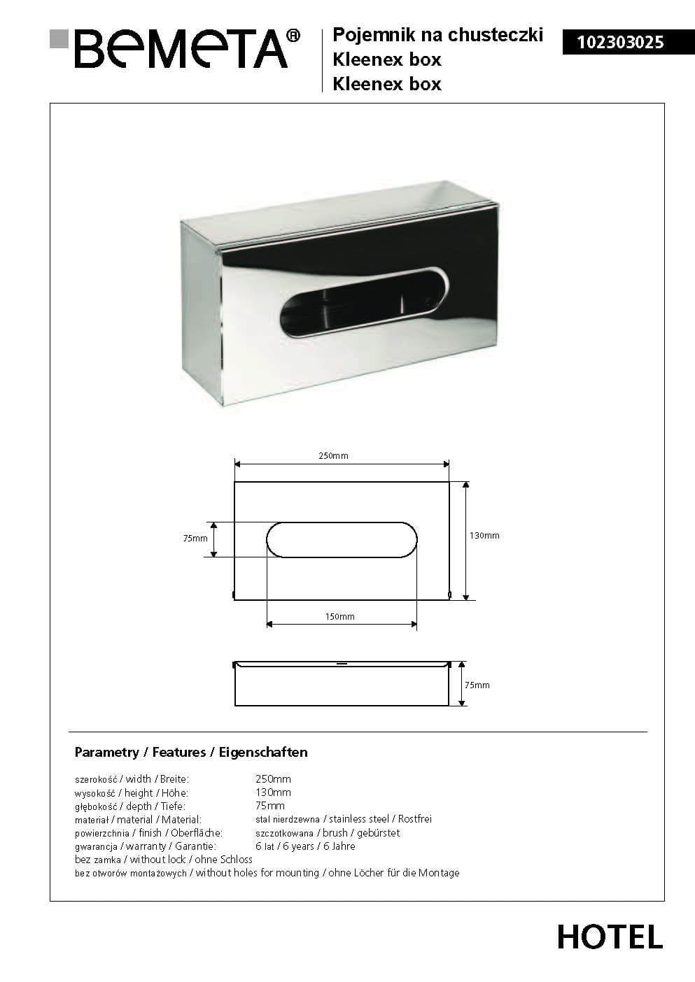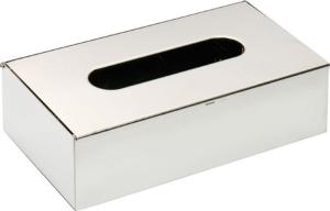 Pojemnik na chusteczki higieniczne wykonany ze stali nierdzewnej, powierzchnia szczotkowana matowa.