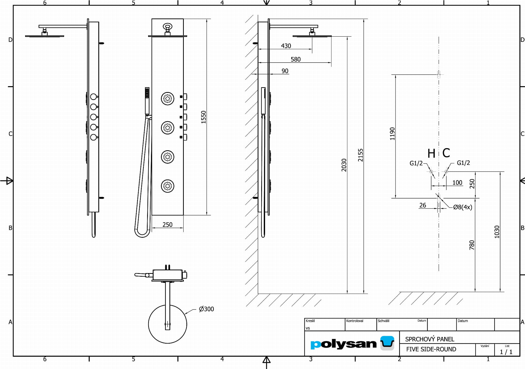 Panel prysznicowy z baterią 155x25 cm aluminium 5SIDE 80211 Polysan