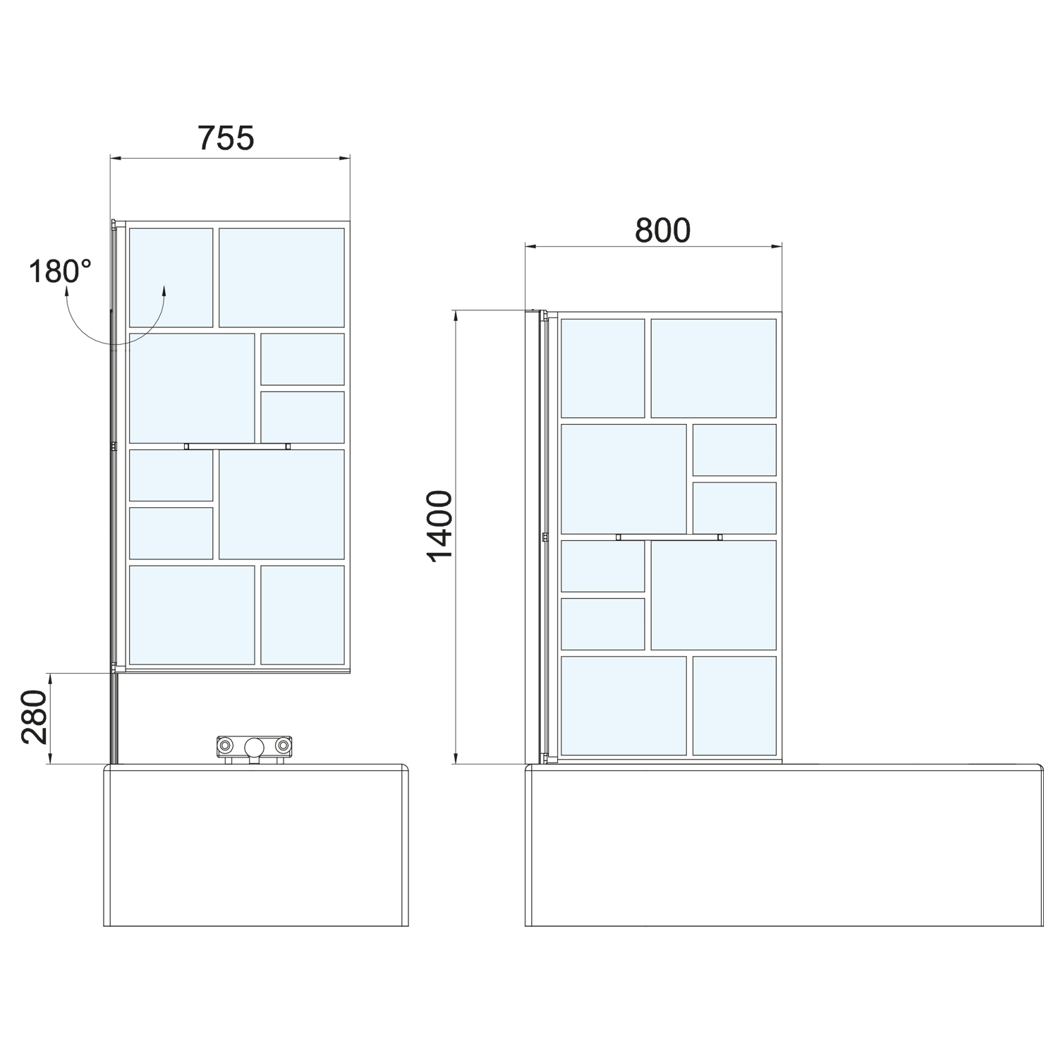 Wysokość 140 cm, szerokość 80 cm , podnoszenie do 28 cm. Blokada parawanu na brzegu wanny w pozycji rozłożonej, szkło bezpieczne, transparentne (przezroczyste) o grubości 5 mm .Szkło hartowane zdobione sitodrukiem emaliowanym, który sprawia wrażenie podzielenia tafli szkła na pojedyncze okienka