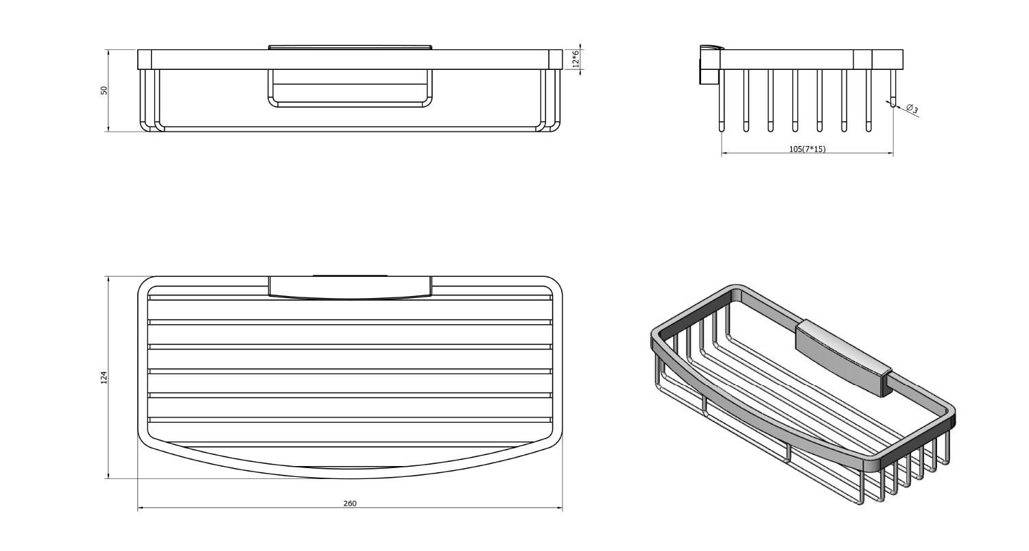 Półka prostokątna, z mosiądzu pod prysznic. Wymiar: 26x12,4x5 cm.