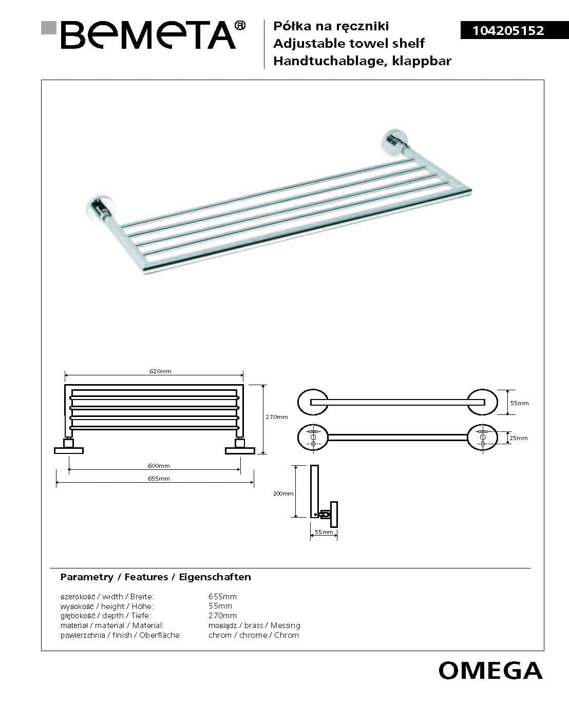 Półka na ręczniki składana 65,5 cm OMEGA 104205152 Bemeta wymiary