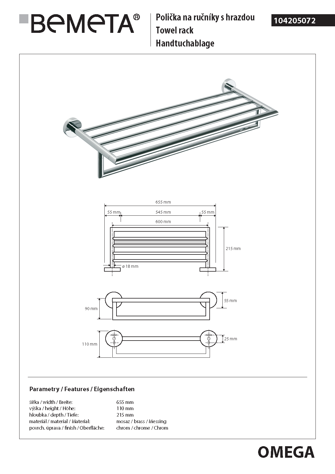 Półka na ręczniki z relingiem 65,5 cm OMEGA 104205072 Bemeta wymiary