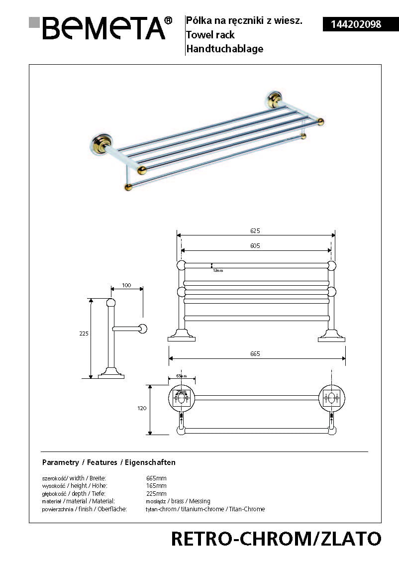 Półka na ręczniki z wieszakiem 60,5 cm chrom - złoto RETRO 144202098 Bemeta