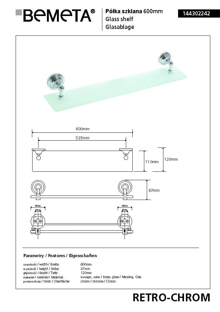 Półka szklana 60 cm chrom połysk RETRO 144302242 Bemeta