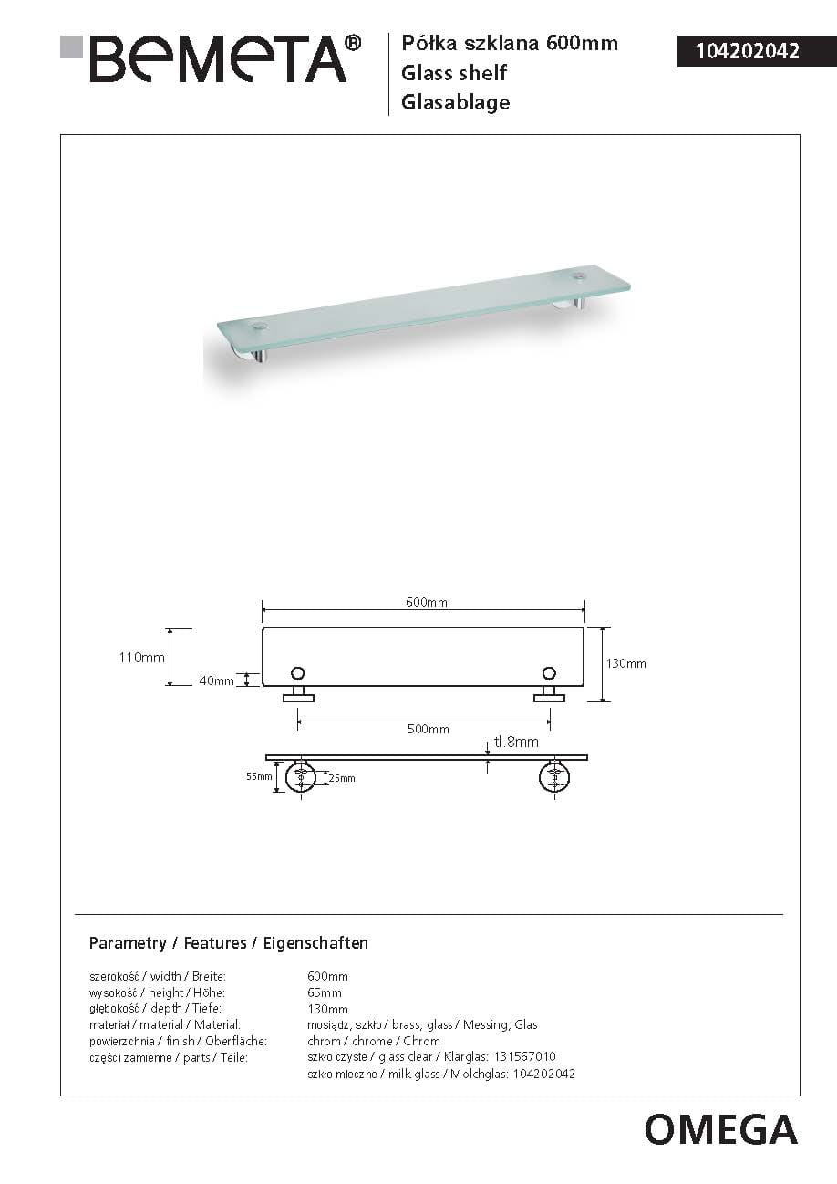 Półka szklana 60 cm OMEGA 104202042 Bemeta wymiary