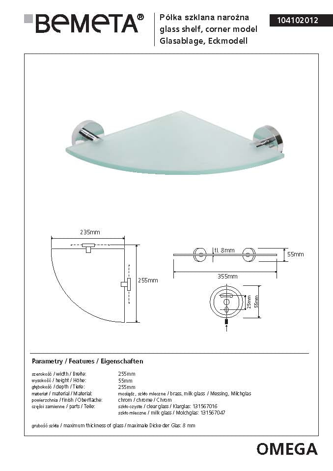 Półka szklana narożna 25 x 25 cm OMEGA 104102012 Bemeta wymiary