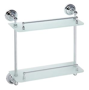 Półka podwójna wykonana z mosiądzu, pokryta chromem w wykończeniu chrom połysk. Szkło półki mleczne.