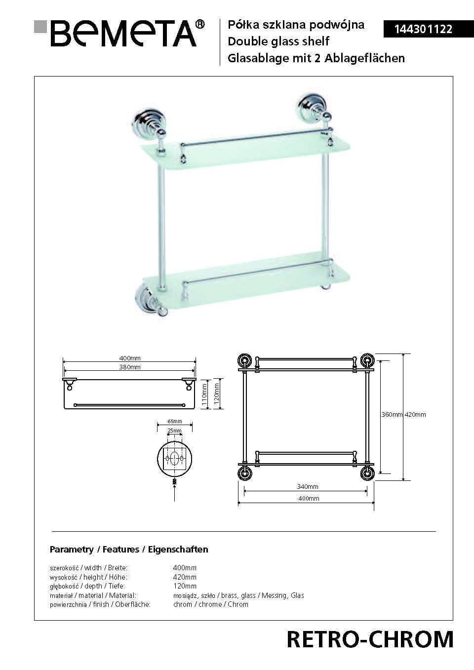 Półka szklana podwójna z relingiem 40 x 42 cm chrom połysk RETRO 144301122 Bemeta