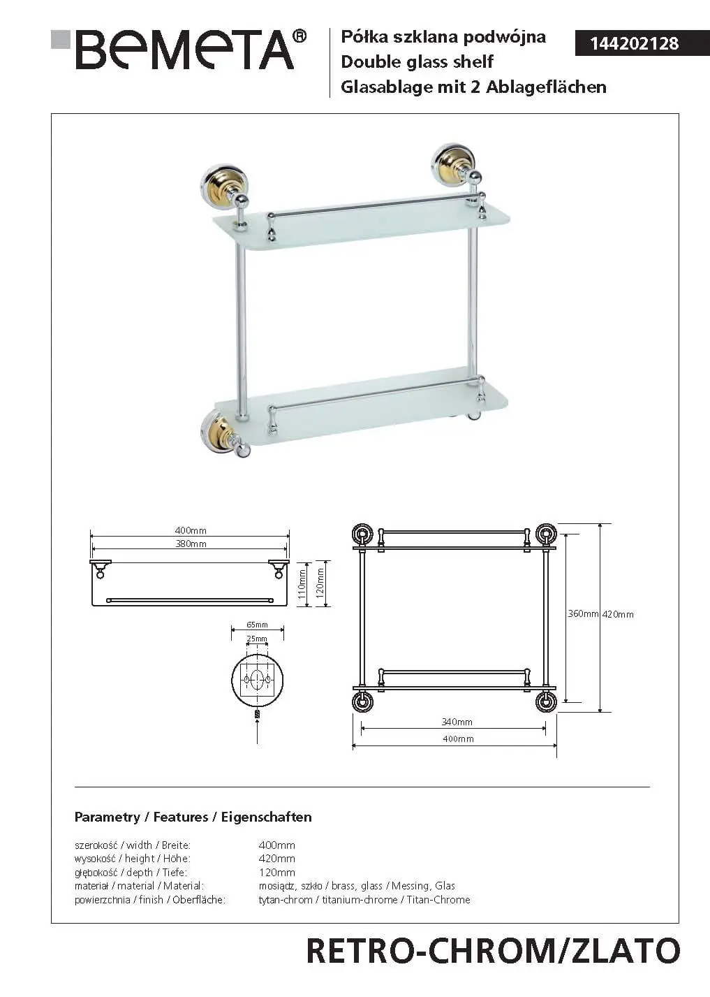 Półka szklana podwójna z relingiem 40 x 42 cm chrom - złoto RETRO 144202128 Bemeta