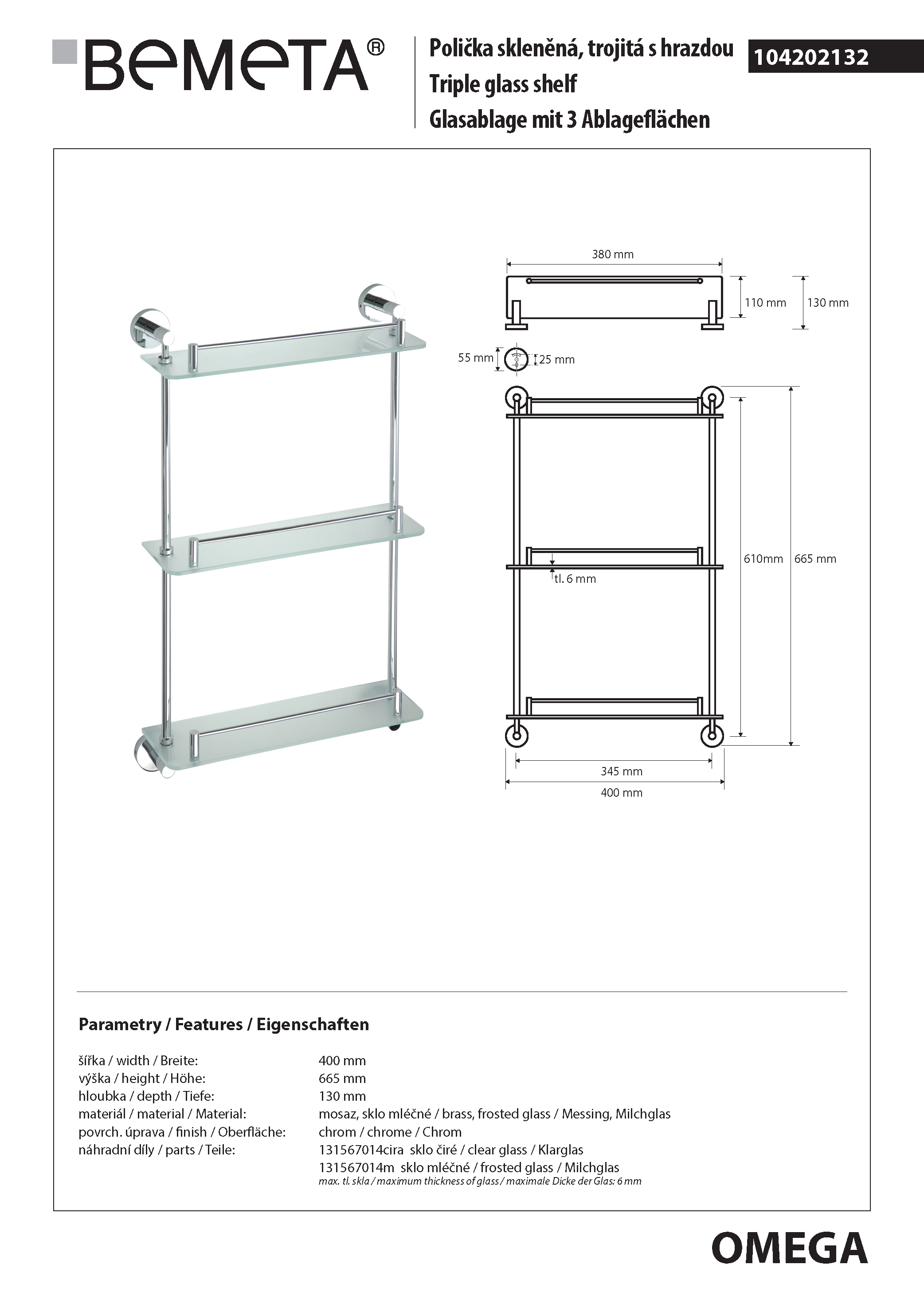 Półka szklana potrójna z relingiem 40 x 66,5 x 13 cm OMEGA 104202132 Bemeta wymiary