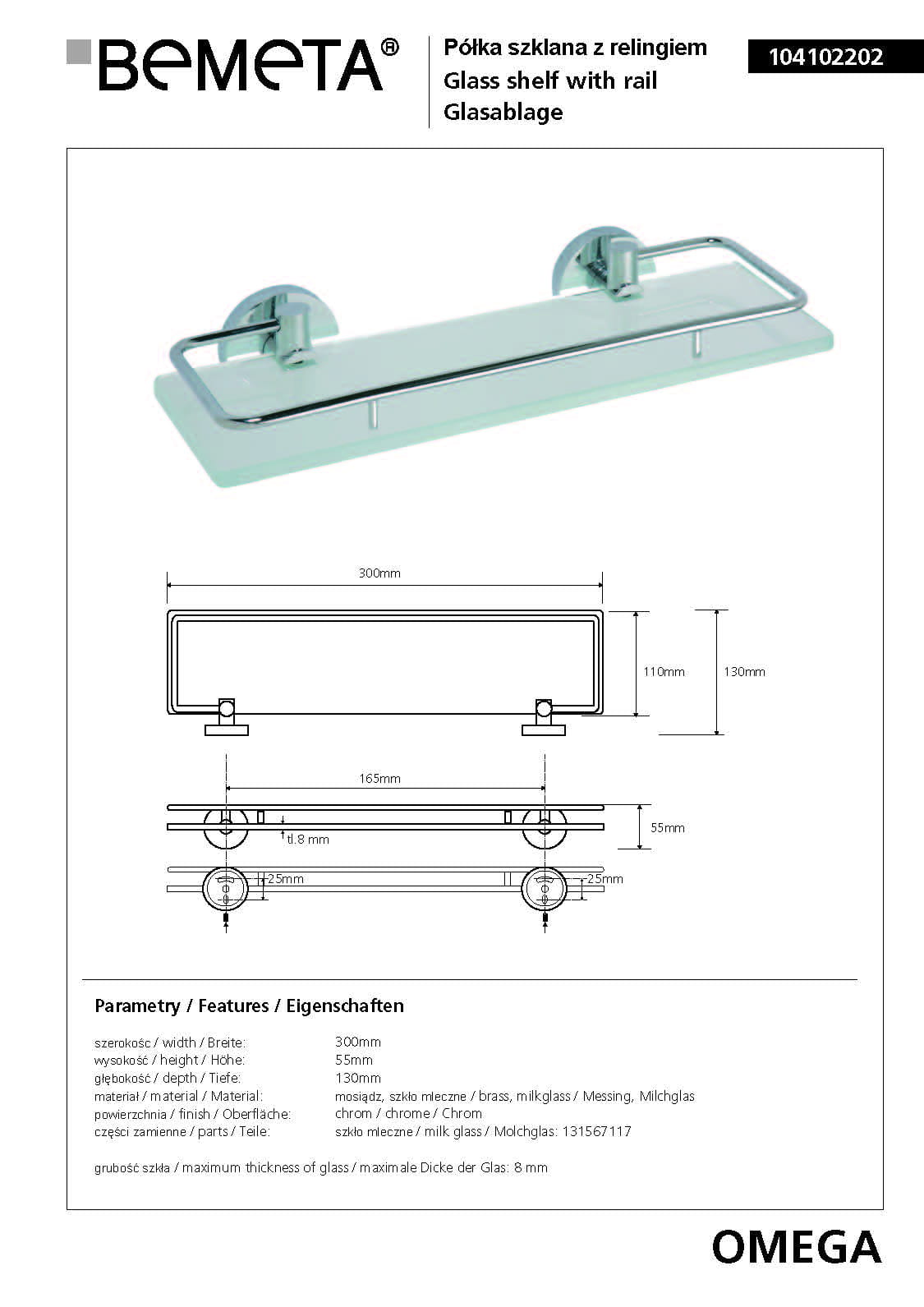 Półka szklana z relingiem 30 cm OMEGA 104102202 Bemeta wymiary
